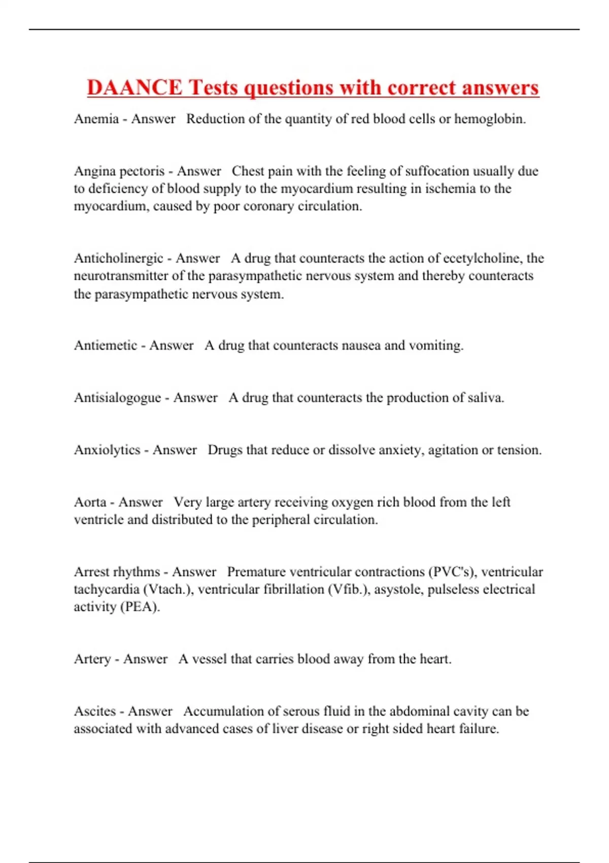 Anemia - Answer Reduction of the quantity of red blood cells or hemoglobin. Angina pectoris - Answer Chest pain with the feeling of suffocation usually due to deficiency of blood supply to the myocardium resulting in ischemia to the myocardium, caused by poor coronary circulation. Anticholinergic - Answer A drug that counteracts the action of ecetylcholine, the neurotransmitter of the parasympathetic nervous system and thereby counteracts the parasympathetic nervous system. Antiemetic - Answer A drug that counteracts nausea and vomiting. Antisialogogue - Answer A drug that counteracts the production of saliva. Anxiolytics - Answer Drugs that reduce or dissolve anxiety, agitation or tension. Aorta - Answer Very large artery receiving oxygen rich blood from the left ventricle and distributed to the peripheral circulation. Arrest rhythms - Answer Premature ventricular contractions (PVC's), ventricular tachycardia (Vtach.), ventricular fibrillation (Vfib.), asystole, pulseless electrical activity (PEA). Artery - Answer A vessel that carries blood away from the heart. Ascites - Answer Accumulation of serous fluid in the abdominal ca