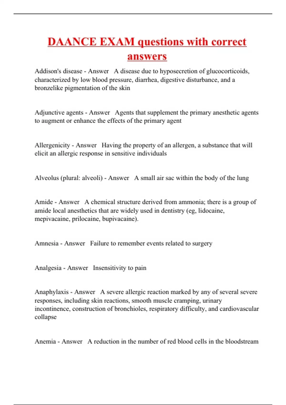 Addison's disease - Answer A disease due to hyposecretion of glucocorticoids, characterized by low blood pressure, diarrhea, digestive disturbance, and a bronzelike pigmentation of the skin Adjunctive agents - Answer Agents that supplement the primary anesthetic agents to augment or enhance the effects of the primary agent Allergenicity - Answer Having the property of an allergen, a substance that will elicit an allergic response in sensitive individuals Alveolus (plural: alveoli) - Answer A small air sac within the body of the lung Amide - Answer A chemical structure derived from ammonia; there is a group of amide local anesthetics that are widely used in dentistry (eg, lidocaine, mepivacaine, prilocaine, bupivacaine). Amnesia - Answer Failure to remember events related to surgery Analgesia - Answer Insensitivity to pain Anaphylaxis - Answer A severe allergic reaction marked by any of several severe responses, including skin reactions, smooth muscle cramping, urinary incontinence, construction of bronchioles, respiratory difficulty, and cardiovascular collapse