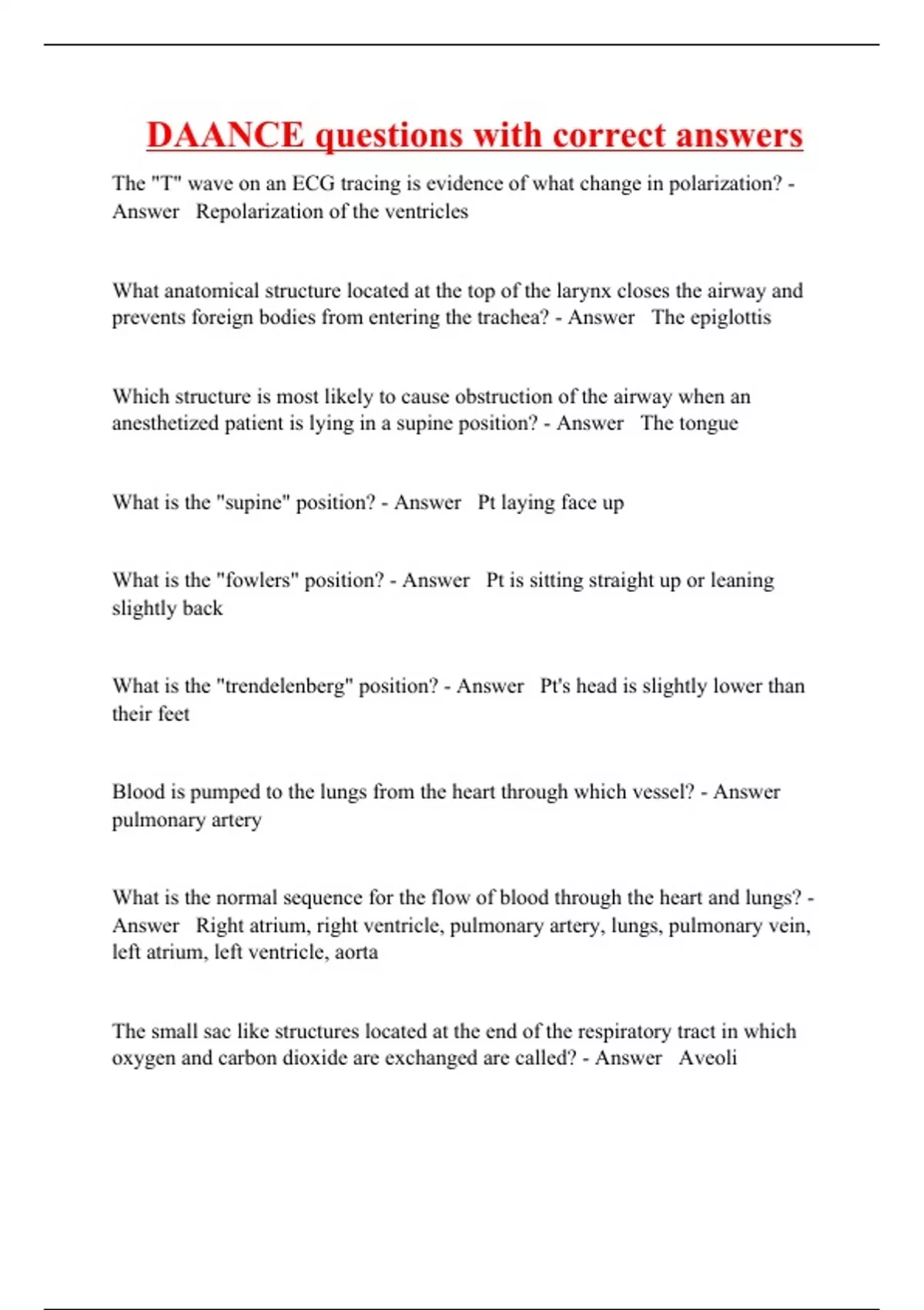 The "T" wave on an ECG tracing is evidence of what change in polarization? - Answer Repolarization of the ventricles What anatomical structure located at the top of the larynx closes the airway and prevents foreign bodies from entering the trachea? - Answer The epiglottis Which structure is most likely to cause obstruction of the airway when an anesthetized patient is lying in a supine position? - Answer The tongue What is the "supine" position? - Answer Pt laying face up What is the "fowlers" position? - Answer Pt is sitting straight up or leaning slightly back What is the "trendelenberg" position? - Answer Pt's head is slightly lower than their feet Blood is pumped to the lungs from the heart through which vessel? - Answer pulmonary artery What is the normal sequence for the flow of blood through the heart and lungs? - Answer Right atrium, right ventricle, pulmonary artery, lungs, pulmonary vein, left atrium, left ventricle, aorta The small sac like structures located at the end of the respiratory tract in which oxygen and carbon dioxide are exchanged are called? - Answer Aveoli