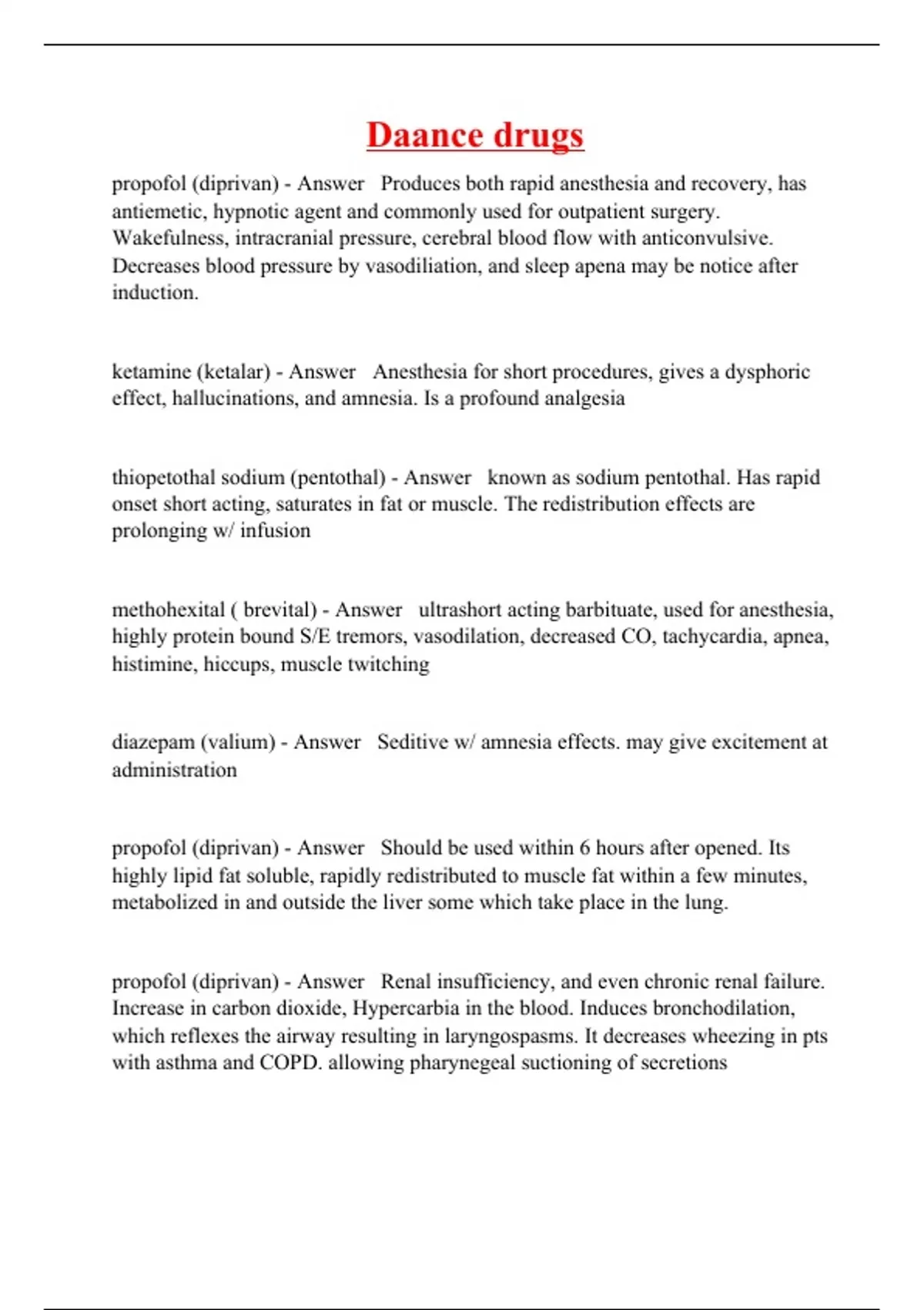 propofol (diprivan) - Answer Produces both rapid anesthesia and recovery, has antiemetic, hypnotic agent and commonly used for outpatient surgery. Wakefulness, intracranial pressure, cerebral blood flow with anticonvulsive. Decreases blood pressure by vasodiliation, and sleep apena may be notice after induction. ketamine (ketalar) - Answer Anesthesia for short procedures, gives a dysphoric effect, hallucinations, and amnesia. Is a profound analgesia thiopetothal sodium (pentothal) - Answer known as sodium pentothal. Has rapid onset short acting, saturates in fat or muscle. The redistribution effects are prolonging w/ infusion methohexital ( brevital) - Answer ultrashort acting barbituate, used for anesthesia, highly protein bound S/E tremors, vasodilation, decreased CO, tachycardia, apnea, histimine, hiccups, muscle twitching diazepam (valium) - Answer Seditive w/ amnesia effects. may give excitement at administration