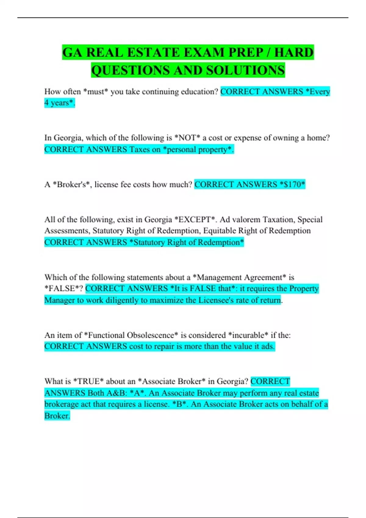 GA REAL ESTATE EXAM PREP / HARD QUESTIONS AND SOLUTIONS