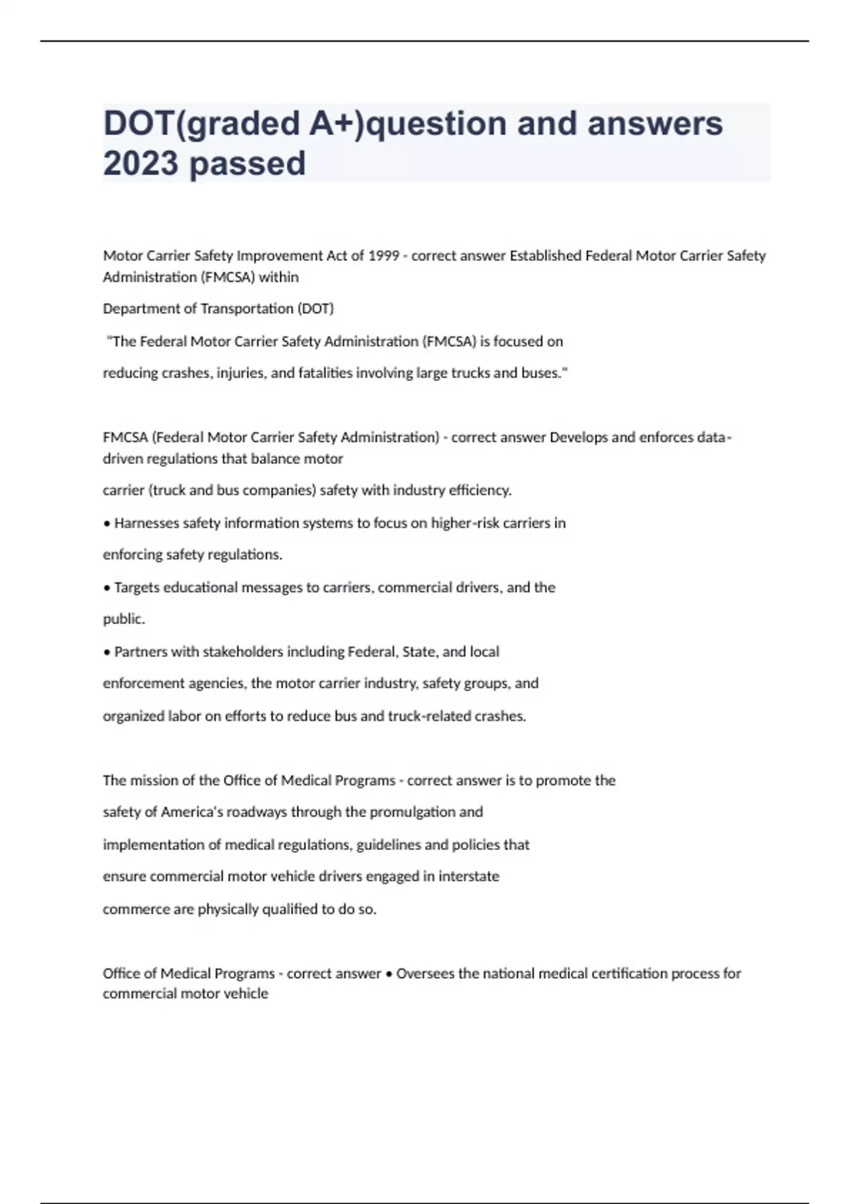 DOT(graded A+)question and answers 2023 passedMotor Carrier Safety Improvement Act of 1999 - correct answer Established Federal Motor Carrier Safety Administration (FMCSA) within Department of Transportation (DOT) "The Federal Motor Carrier Safety Administration (FMCSA) is focused on reducing crashes, injuries, and fatalities involving large trucks and buses." FMCSA (Federal Motor Carrier Safety Administration) - correct answer Develops and enforces data‐driven regulations that balance motor carrier (truck and bus companies) safety with industry efficiency. • Harnesses safety information systems to focus on higher‐risk carriers in enforcing safety regulations. • Targets educational messages to carriers, commercial drivers, and the public. • Partners with stakeholders including Federal, State, and local enforcement agencies, the motor carrier industry, safety groups, and organized labor on efforts to reduce bus and truck‐related crashes. The mission of the Office of Medical Programs - correct answer is to promote the safety of America's roadways through the promulgation and implementation of medical regulations, guidelines and policies that ensure commercial motor vehicle drivers engaged in interstate commerce are physically qualified to do so. Office of Medical Programs - correct answer • Oversees the national medical certification process for commercial motor vehicle drivers who operate in interstate commerce. • Develops and implements medical regulations, policies, and procedures. • Oversees and supports the Medical Review Board in accordance with the Federal Advisory Committee Act. • Develops and implements the national registry program — a national medical examiner system and a linked national driver medical reporting system. • Conducts and oversees the Agency's medical exemption and certificate programs. • Serves as the lead Federal agency for the regulation of commercial motor vehicle driver health and safety and conducts relevant medical research. National Registry of Certified Medical Examiners (NRCME) - correct answer The primary mission of the National Registry of Certified Medical Examiners is to improve highway safety by producing trained, certified medical examiners (CMEs) who can effectively determine if a commercial motor vehicle driver's health meets Federal Motor Carrier Safety Administration standards. Goals of the Medical Examiner Program - correct answer Improve highway safety • Ensure that medical examiners understand FMCSA medical standards and guidelines and how they apply to interstate CMV drivers • Maintain training and testing program for medical examiners • Promote public confidence in the quality of the medical examiners who certify CMV drivers • Establish an online list of certified medical examiners NRCME Enables FMCSA to Rely On - correct answer State scope of practice to demonstrate clinicians' general clinical knowledge