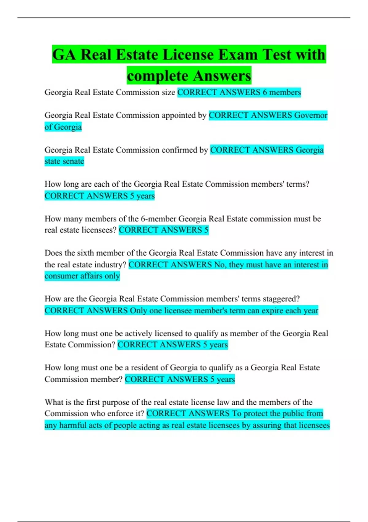GA Real Estate License Exam Test with complete Answers Georgia Real Estate Commission size Georgia Real Estate Commission appointed by Georgia Real Estate Commission confirmed by How long are each of the Georgia Real Estate Commission members' terms? How many members of the 6-member Georgia Real Estate commission must be real estate licensees? Does the sixth member of the Georgia Real Estate Commission have any interest in the real estate industry? How are the Georgia Real Estate Commission members' terms staggered? How long must one be actively licensed to qualify as member of the Georgia Real Estate Commission? How long must one be a resident of Georgia to qualify as a Georgia Real Estate Commission member? What is the first purpose of the real estate license law and the members of the Commission who enforce it? What is the second purpose of the real estate license law and the members of the Commission who enforce it? Commission members' responsibilities What section of law is the Georgia Real Estate Commission's authority based upon? Statutory law What is the purpose of the Commission's rules and regulations? Who administers the license law that regulates brokers, salespersons, and community association managers? Who's authority involves these four separate categories? 1. Issuing licenses; 2. Taking disciplinary action; 3. Passing rules and regulations; 4. Establishing fees Rules and regulations set forth by the Georgia Real Estate Commission may only be adopted if they fall under the "umbrella" of which type of Georgia law? Is it against the law to practice real estate without a license?