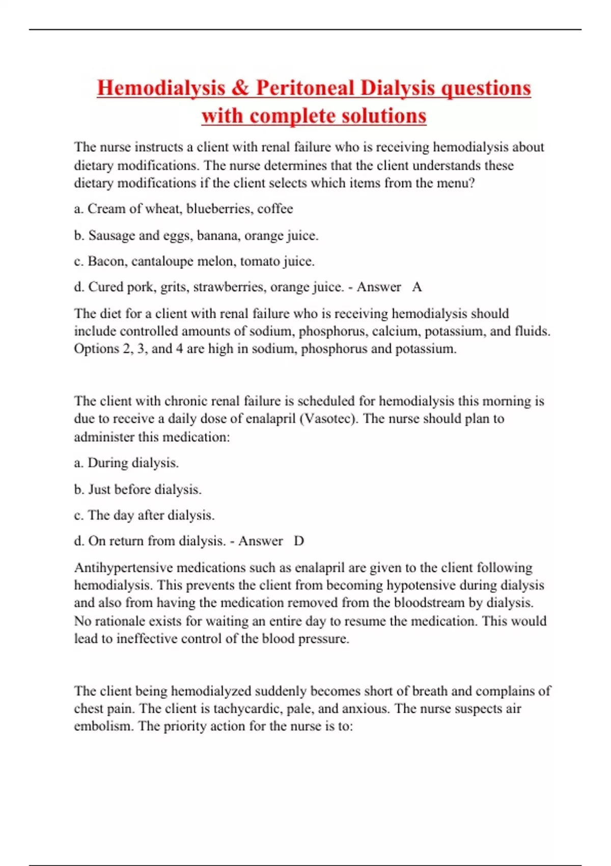 The nurse instructs a client with renal failure who is receiving hemodialysis about dietary modifications. The nurse determines that the client understands these dietary modifications if the client selects which items from the menu? a. Cream of wheat, blueberries, coffee b. Sausage and eggs, banana, orange juice. c. Bacon, cantaloupe melon, tomato juice. d. Cured pork, grits, strawberries, orange juice. - Answer A The diet for a client with renal failure who is receiving hemodialysis should include controlled amounts of sodium, phosphorus, calcium, potassium, and fluids. Options 2, 3, and 4 are high in sodium, phosphorus and potassium. The client with chronic renal failure is scheduled for hemodialysis this morning is due to receive a daily dose of enalapril (Vasotec). The nurse should plan to administer this medication: a. During dialysis. b. Just before dialysis. c. The day after dialysis. d. On return from dialysis. - Answer D Antihypertensive medications such as enalapril are given to the client following hemodialysis. This prevents the client from becoming hypotensive during dialysis and also from having the medication removed from the bloodstream by dialysis. No rationale exists for waiting an entire day to resume the medication. This would lead to ineffective control of the blood pressure. The client being hemodialyzed suddenly becomes short of breath and complains of chest pain. The client is tachycardic, pale, and anxious. The nurse suspects air embolism. The priority action for the nurse is to: