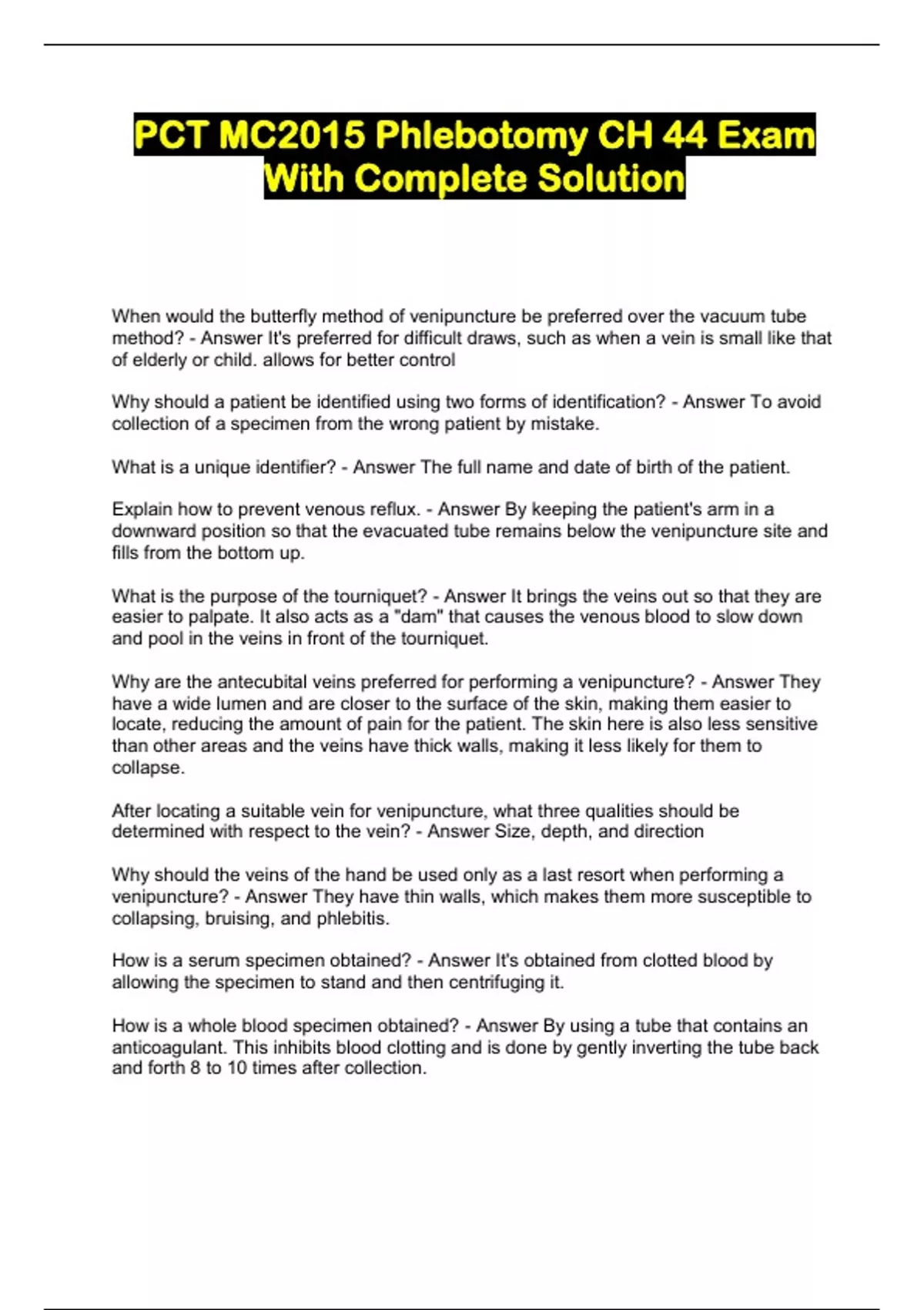 PCT MC2015 Phlebotomy CH 44 Exam With Complete Solution