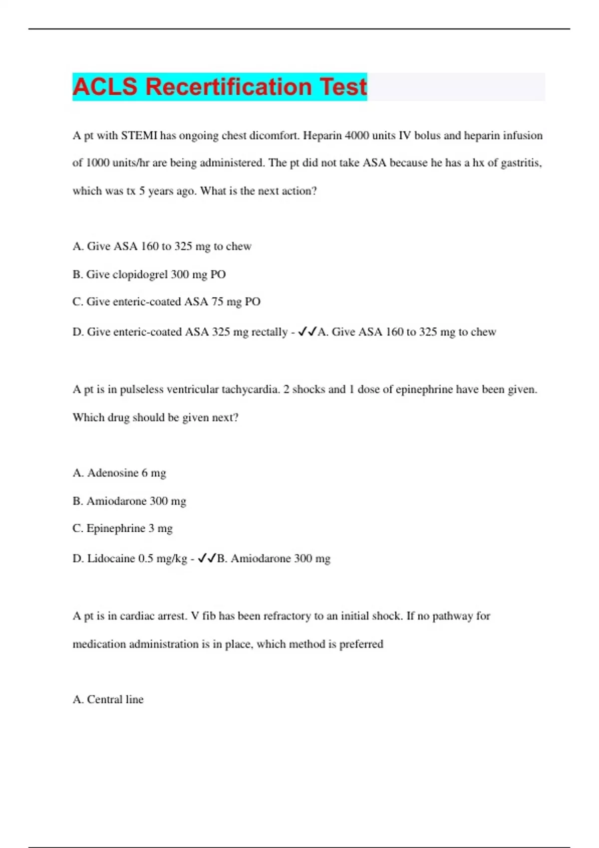 A pt with STEMI has ongoing chest dicomfort. Heparin 4000 units IV bolus and heparin infusion of 1000 units/hr are being administered. The pt did not take ASA because he has a hx of gastritis, which was tx 5 years ago. What is the next action? A. Give ASA 160 to 325 mg to chew B. Give clopidogrel 300 mg PO C. Give enteric-coated ASA 75 mg PO D. Give enteric-coated ASA 325 mg rectally - A. Give ASA 160 to 325 mg to chew A pt is in pulseless ventricular tachycardia. 2 shocks and 1 dose of epinephrine have been given. Which drug should be given next? A. Adenosine 6 mg B. Amiodarone 300 mg C. Epinephrine 3 mg D. Lidocaine 0.5 mg/kg - B. Amiodarone 300 mg