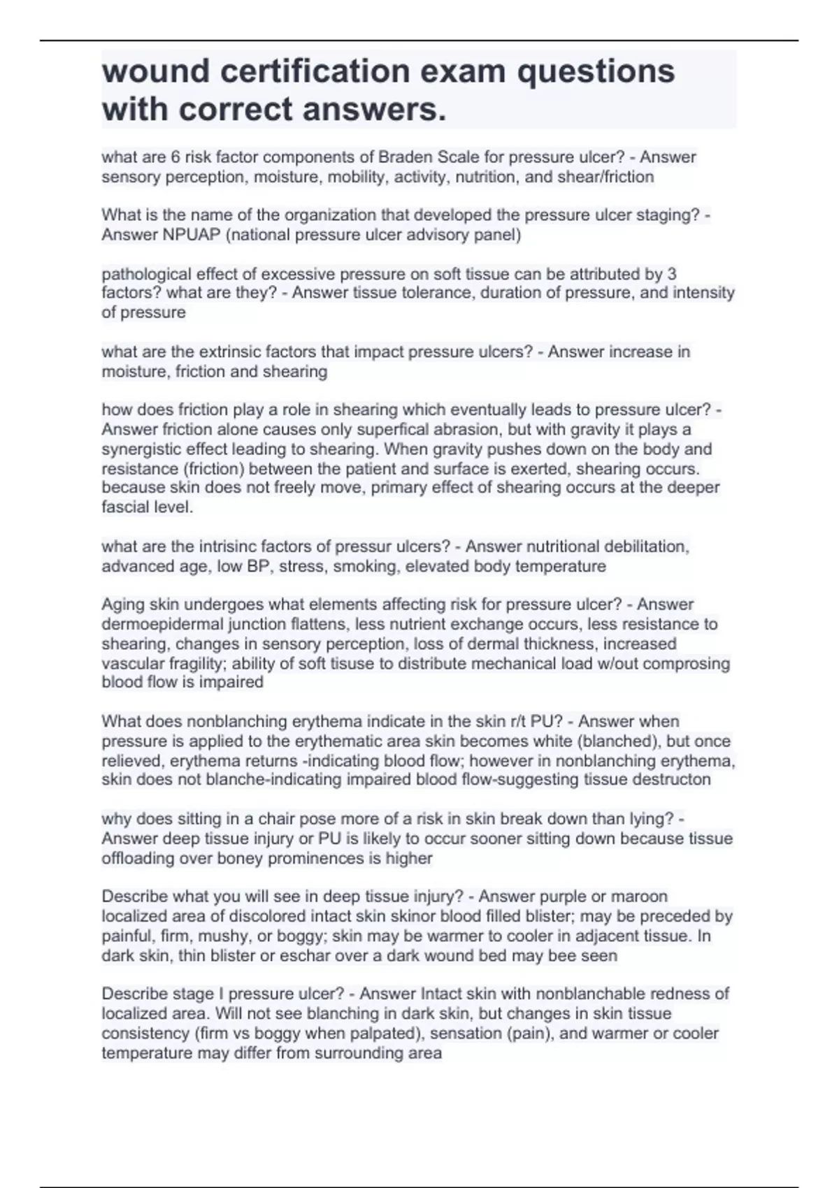 what are 6 risk factor components of Braden Scale for pressure ulcer? - Answer sensory perception, moisture, mobility, activity, nutrition, and shear/friction What is the name of the organization that developed the pressure ulcer staging? - Answer NPUAP (national pressure ulcer advisory panel) pathological effect of excessive pressure on soft tissue can be attributed by 3 factors? what are they? - Answer tissue tolerance, duration of pressure, and intensity of pressure what are the extrinsic factors that impact pressure ulcers? - Answer increase in moisture, friction and shearing how does friction play a role in shearing which eventually leads to pressure ulcer? - Answer friction alone causes only superfical abrasion, but with gravity it plays a synergistic effect leading to shearing. When gravity pushes down on the body and resistance (friction) between the patient and surface is exerted, shearing occurs. because skin does not freely move, primary effect of shearing occurs at the deeper fascial level. what are the intrisinc factors of pressur ulcers? - Answer nutritional debilitation, advanced age, low BP, stress, smoking, elevated body temperature Aging skin undergoes what elements affecting risk for pressure ulcer? - Answer dermoepidermal junction flattens, less nutrient exchange occurs, less resistance to shearing, changes in sensory perception, loss of dermal thickness, increased vascular fragility; ability of soft tisuse to distribute mechanical load w/out comprosing blood flow is impaired What does nonblanching erythema indicate in the skin r/t PU? - Answer when pressure is applied to the erythematic area skin becomes white (blanched), but once relieved, erythema returns -indicating blood flow; however in nonblanching erythema, skin does not blanche-indicating impaired blood flow-suggesting tissue destructon why does sitting in a chair pose more of a risk in skin break down than lying? - Answer deep tissue injury or PU is likely to occur sooner sitting down because tissue offloading over boney prominences is higher Describe what you will see in deep tissue injury? - Answer purple or maroon localized area of discolored intact skin skinor blood filled blister; may be preceded by painful, firm, mushy, or boggy; skin may be warmer to cooler in adjacent tissue. In dark skin, thin blister or eschar over a dark wound bed may bee seen Describe stage I pressure ulcer? - Answer Intact skin with nonblanchable redness of localized area. Will not see blanching in dark skin, but changes in skin tissue consistency (firm vs boggy when palpated), sensation (pain), and warmer or cooler temperature may differ from surrounding area Describe stage II pressure ulcer? - Answer partial-thickness wound where epidermis and tip of dermis is lost with red-pink wound bed w/out slough. may also present as intact or open/ruptured serum -filled blister Describe stage III pressure ulcer? - Answer full-thickness wound where both epidermis and dermis is lost and subcutaneous tissue may be visible, but deeper structures such as muscle, bone, and tendon are not exposed; slough my be present but it doesn't obscure depth and tunneling and undermining may be present Describe stage IV pressure ulcer? - Answer full-thickness wound with exposed bone,tendon, and muscle; slough or eschar may be seen in some parts of the wound bed. you will often see tunneling and undermining. Osteomyelitis may be dxed at this stage, since bone is palpable Describe unstageble ulcers? - Answer full-thickness wound where base of the ulcer is covered by slough and/or eschar, obscuring depth When should eschars not be removed? - Answer when it's stable with dry, adherent, and intact w/out erythema on the heel; this serves as the body's natural cover and should not be removed. Therapeutic function of pressure distribution is accomplised by what 2 factors? - Answer immersion and envelopement Define immersion? - Answer depth of penetration or skining into surgace allowing pressure to be spread out over surrounding area rather than directly over boney prominence Define envelopement? - Answer is the ability of support surface to conform to irregularities without causing substantial increase in pressure what is bottoming out? - Answer this occurs when depth of penetration or sinking is excessive, allowing increased pressure to concentrate over boney prominences what factors contribute to bottoming out? - Answer weight, disproportion of weight and size such as amputation, tendency to keep HOB >30 degrees, inappropriate support surface settings When should you consider reactive support surface with features and components such as low air loss, alternating pressure, viscous or air fluids? - Answer for patients who cannot effectively position off their wound, have PUs in multiple turning surfaces, or have PUs that fail to improve despite optimal comprehensive management When should active support surface be considered? - Answer when effective positioning is determined by an MD to be medically contraindicated What is the difference between an active and reactive support surfaces/ - Answer active support surface is a powered mattress or overlay that changes it's load- distribution with or without applied load; pressure is redistributed across the body by inflating and deflating the cells of alternating zones. conversely a reactive support surface moves or changes load-distribution properties only in response to applied load, such as the patient's body. When are active support surfaces appropriate? - Answer when manual frequent repositioning is not possible when are reactive support surfaces appropriate? - Answer for pressure ulcer prevention what is a benefit in low air loss feature and when is it contraindicated? - Answer low air loss assists in managing mositure. It is contraindicated in patients with unstable spine and it puts patients at risk for entrapment when is an air fluidized feature integrated in bed systems appropriate? - Answer for patients with