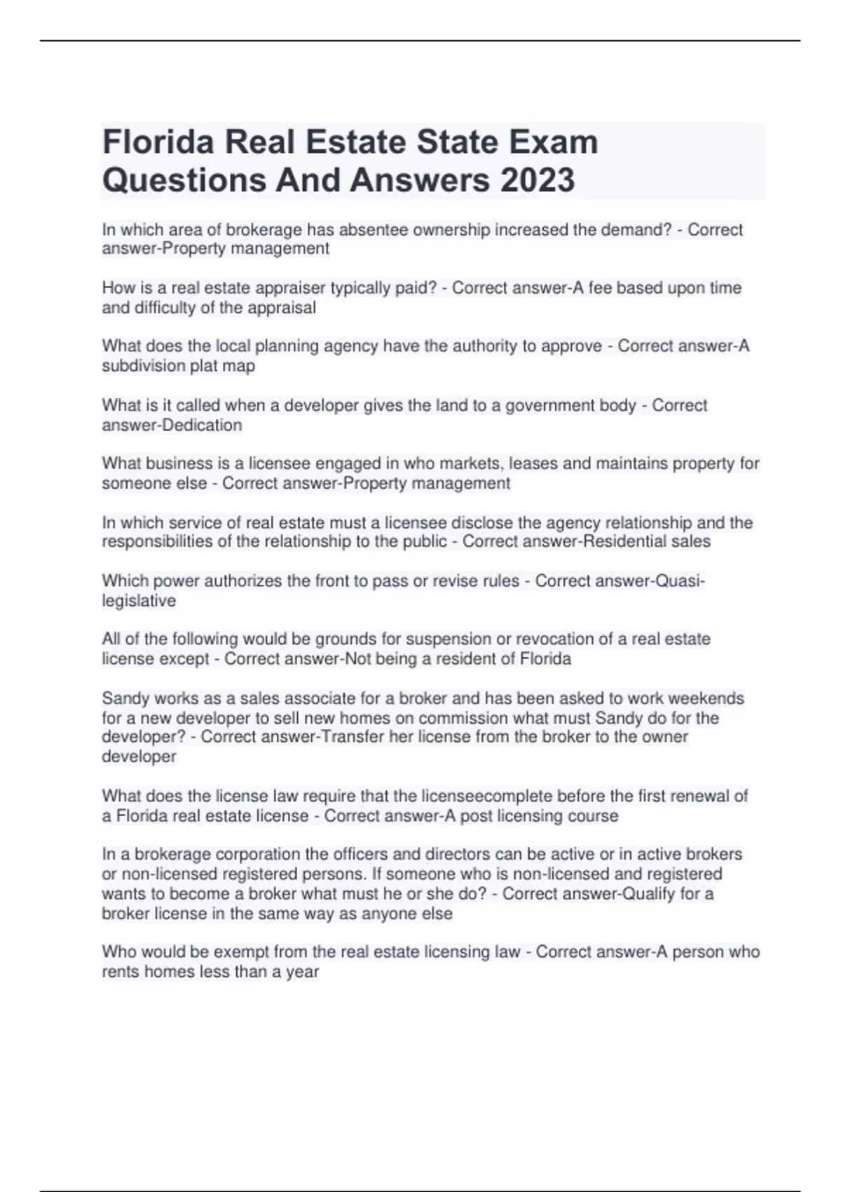 Florida Real Estate State Exam Questions And Answers 2023
