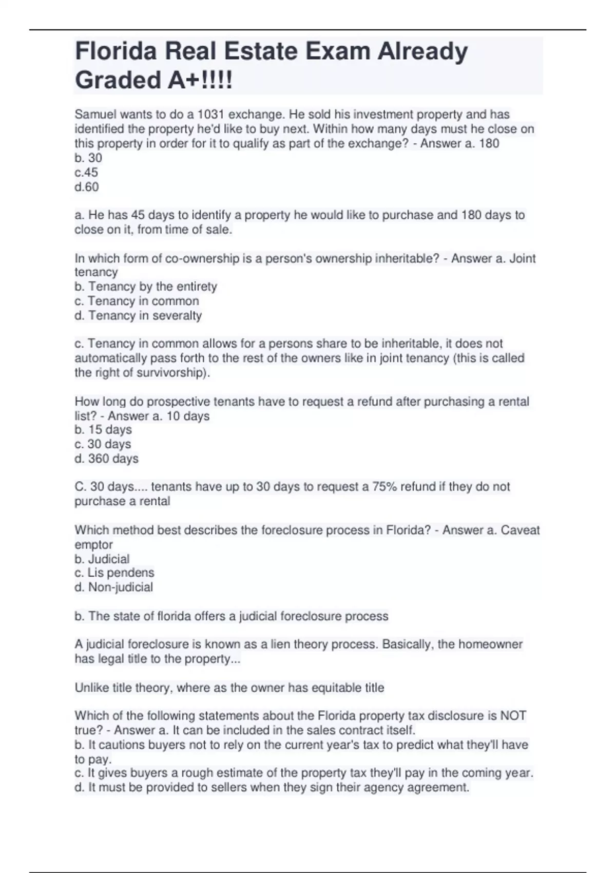 florida real estate exam already graded a questions and answers
