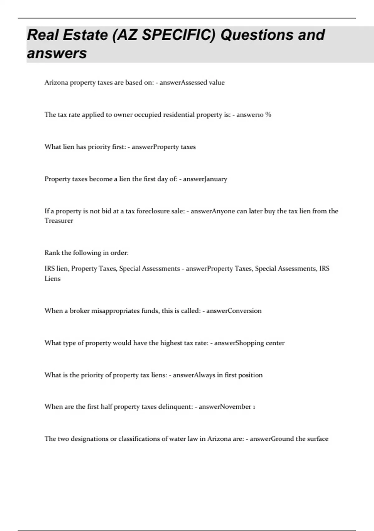 Real Estate (AZ SPECIFIC) Questions and answers