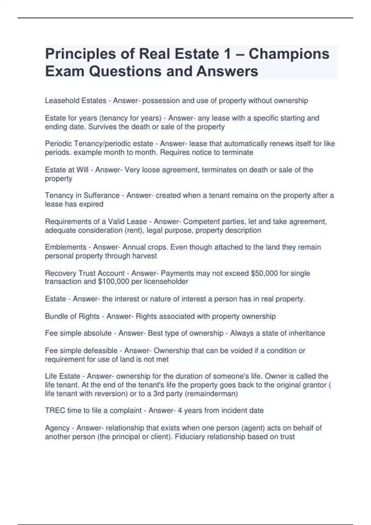Principles of Real Estate 1 – Champions Exam Questions and Answers