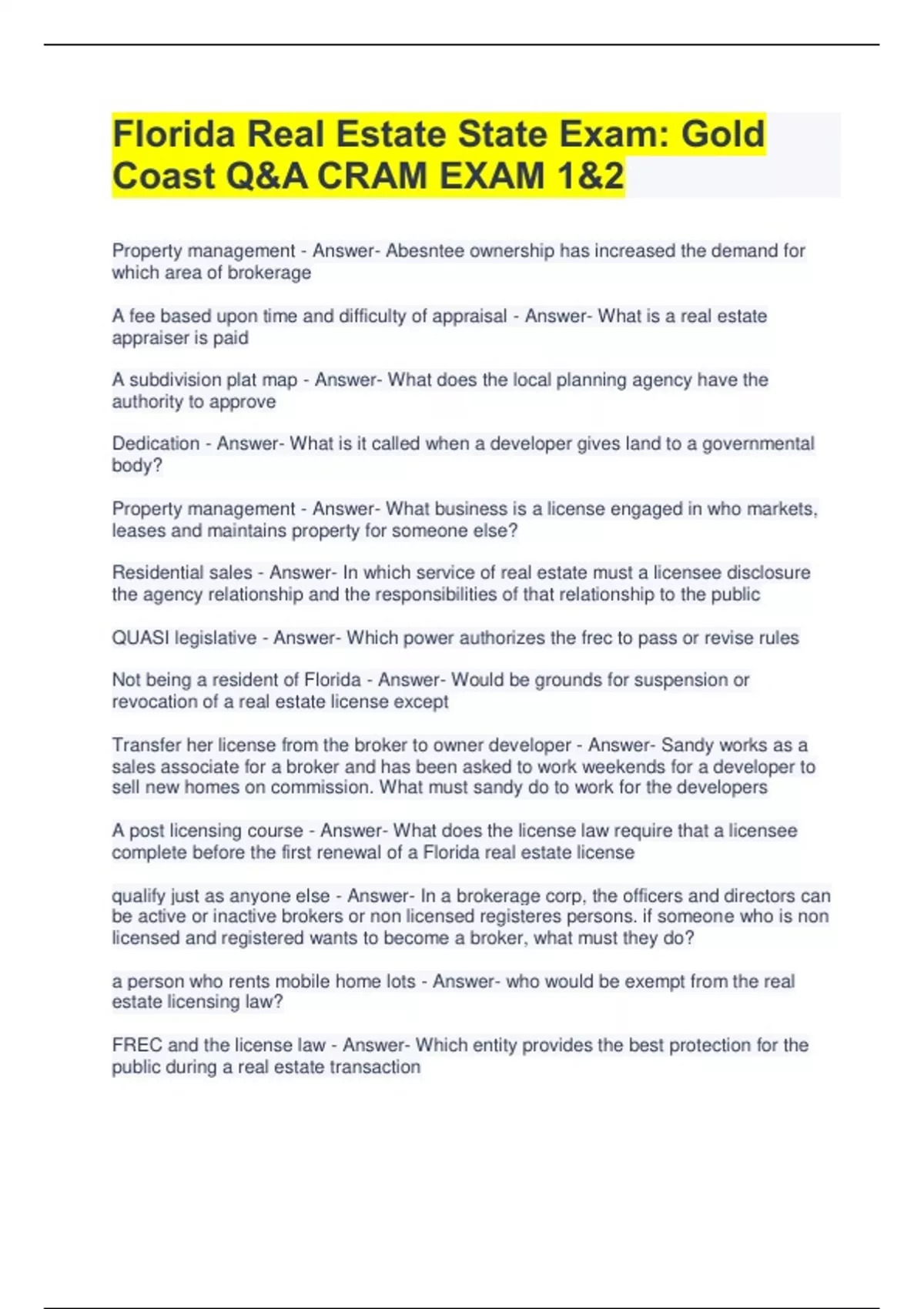 Florida Real Estate State Exam; GOLD COAST QUESTIONS AND ANSWERS CRAM EXAM 1&2