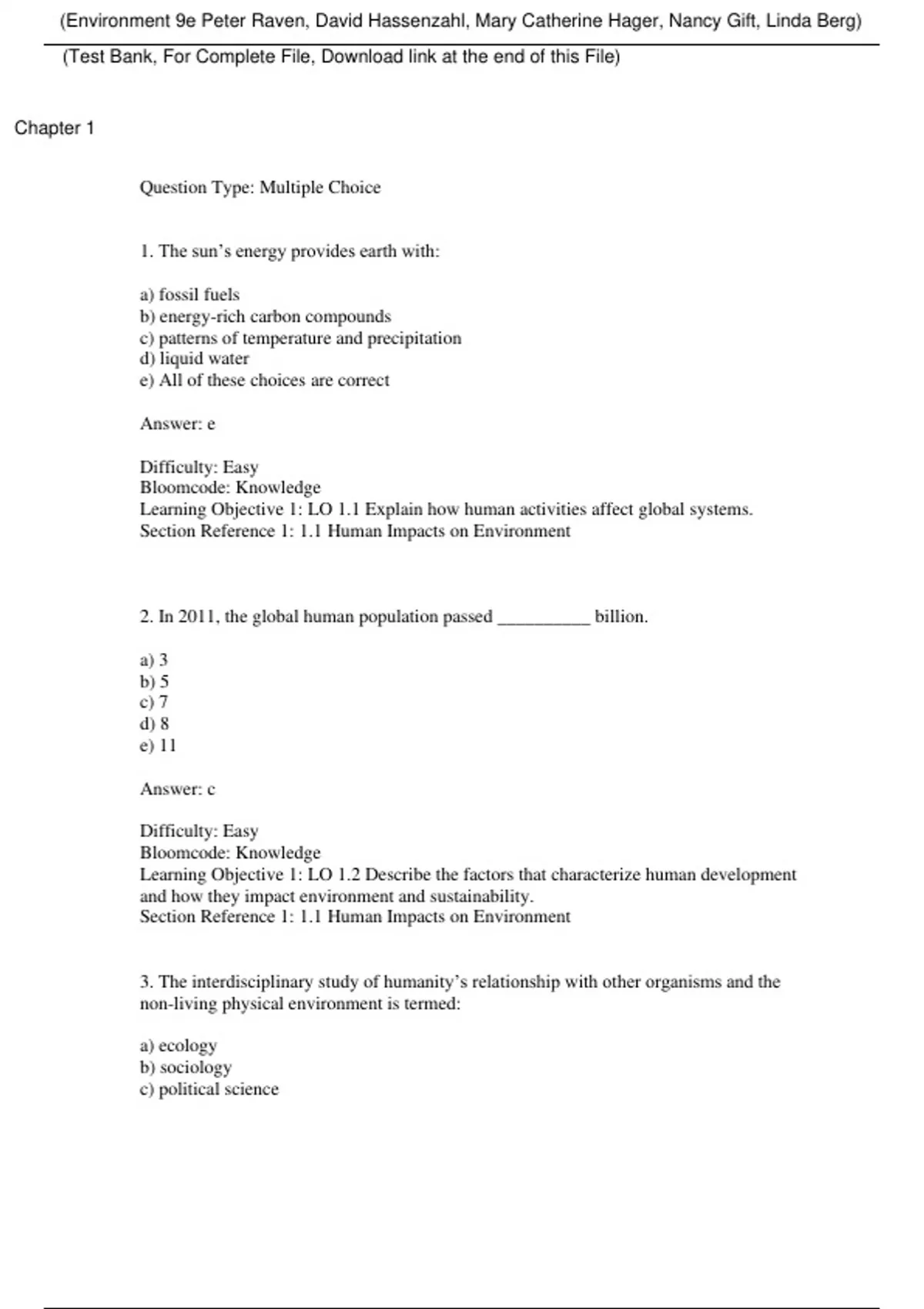 Environment 9e Peter Raven, David Hassenzahl, Mary Catherine Hager, Nancy Gift, Linda Berg (Test Bank) Environment 9e Peter Raven, David Hassenzahl, Mary Catherine Hager, Nancy Gift, Linda Berg (Test Bank)