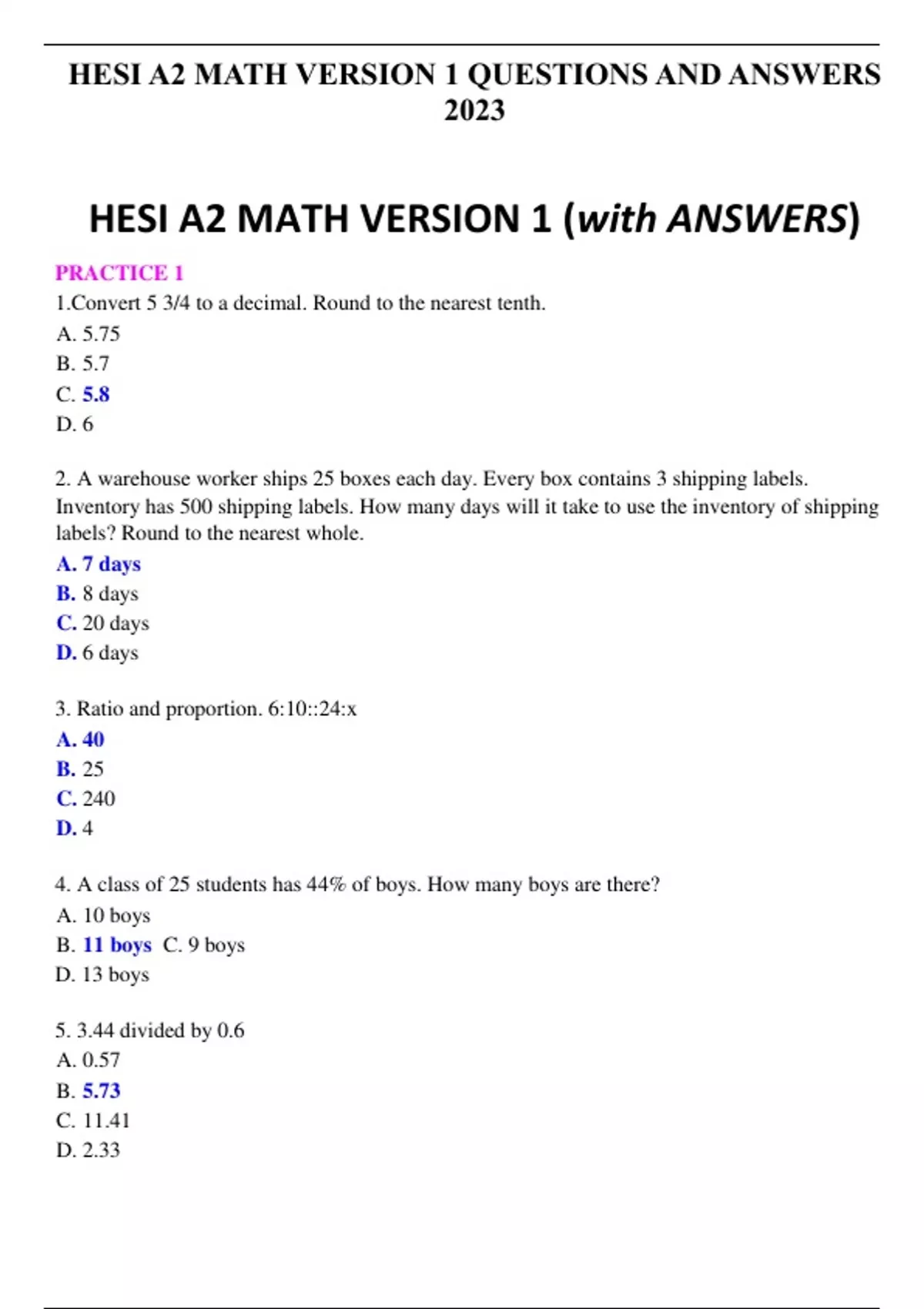 HESI A2 MATH VERSION 1 QUESTIONS AND ANSWERS 2023