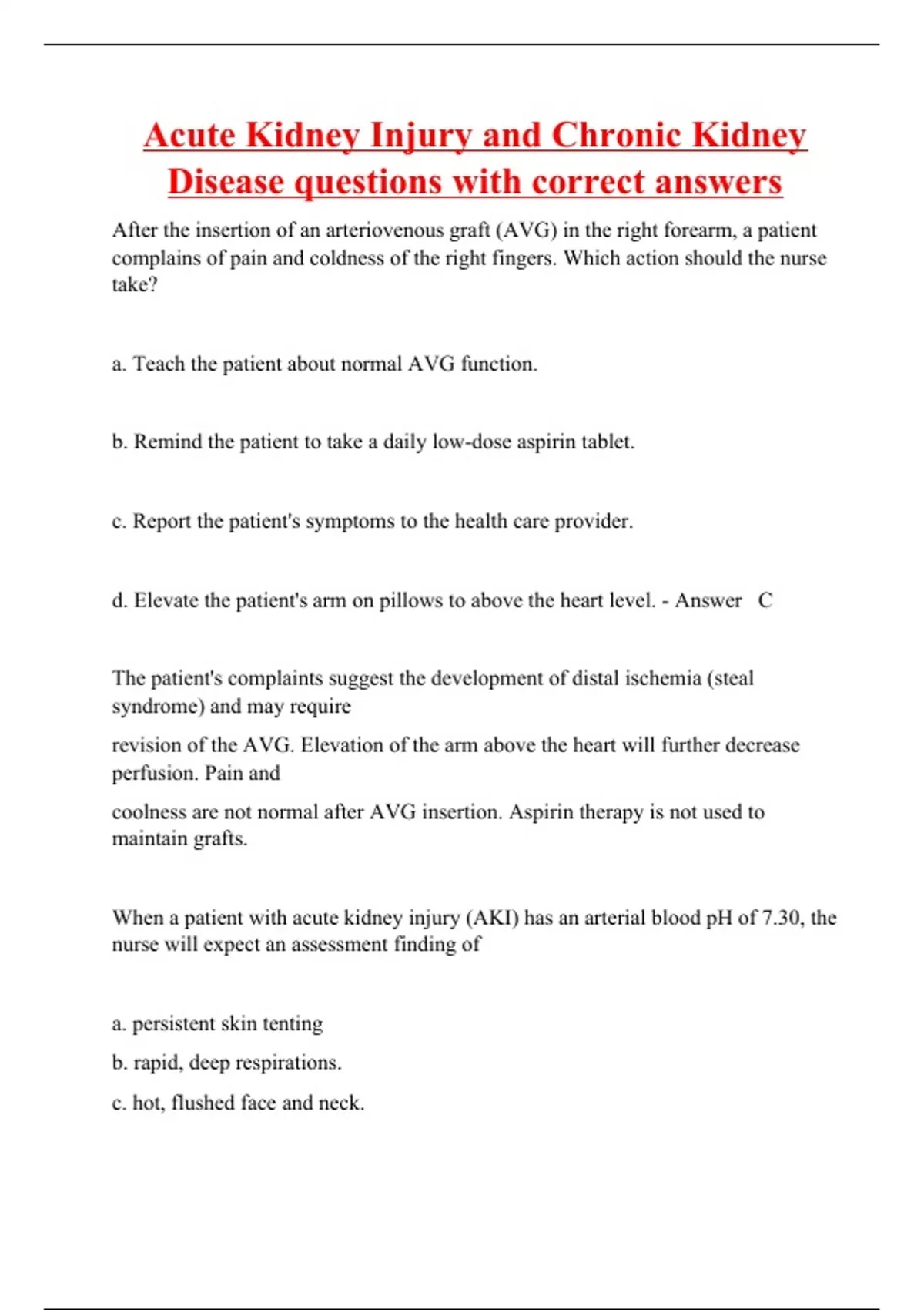 After the insertion of an arteriovenous graft (AVG) in the right forearm, a patient complains of pain and coldness of the right fingers. Which action should the nurse take? a. Teach the patient about normal AVG function. b. Remind the patient to take a daily low-dose aspirin tablet. c. Report the patient's symptoms to the health care provider. d. Elevate the patient's arm on pillows to above the heart level. - Answer C The patient's complaints suggest the development of distal ischemia (steal syndrome) and may require revision of the AVG. Elevation of the arm above the heart will further decrease perfusion. Pain and coolness are not normal after AVG insertion. Aspirin therapy is not used to maintain grafts. When a patient with acute kidney injury (AKI) has an arterial blood pH of 7.30, the nurse will expect an assessment finding of a. persistent skin tenting b. rapid, deep respirations.