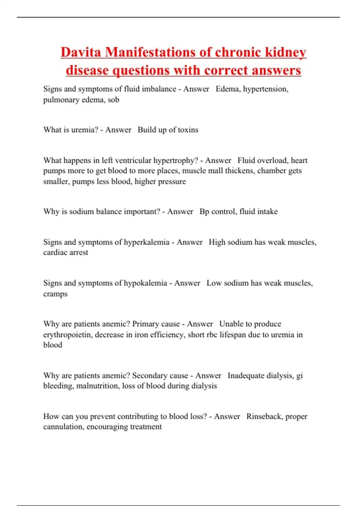 Davita Manifestations of chronic kidney disease questions with correct answers
