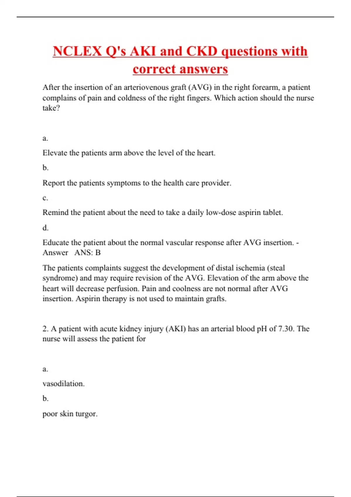 After the insertion of an arteriovenous graft (AVG) in the right forearm, a patient complains of pain and coldness of the right fingers. Which action should the nurse take? a. Elevate the patients arm above the level of the heart. b. Report the patients symptoms to the health care provider. c. Remind the patient about the need to take a daily low-dose aspirin tablet. d. Educate the patient about the normal vascular response after AVG insertion. - Answer ANS: B The patients complaints suggest the development of distal ischemia (steal syndrome) and may require revision of the AVG. Elevation of the arm above the heart will decrease perfusion. Pain and coolness are not normal after AVG insertion. Aspirin therapy is not used to maintain grafts. 2. A patient with acute kidney injury (AKI) has an arterial blood pH of 7.30. The nurse will assess the patient for a. vasodilation. b. poor skin turgor.