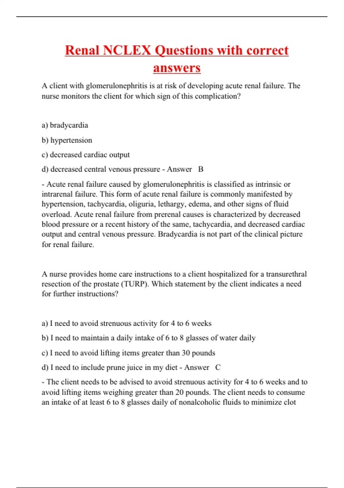 A client with glomerulonephritis is at risk of developing acute renal failure. The nurse monitors the client for which sign of this complication? a) bradycardia b) hypertension c) decreased cardiac output d) decreased central venous pressure - Answer B - Acute renal failure caused by glomerulonephritis is classified as intrinsic or intrarenal failure. This form of acute renal failure is commonly manifested by hypertension, tachycardia, oliguria, lethargy, edema, and other signs of fluid overload. Acute renal failure from prerenal causes is characterized by decreased blood pressure or a recent history of the same, tachycardia, and decreased cardiac output and central venous pressure. Bradycardia is not part of the clinical picture for renal failure. A nurse provides home care instructions to a client hospitalized for a transurethral resection of the prostate (TURP). Which statement by the client indicates a need for further instructions? a) I need to avoid strenuous activity for 4 to 6 weeks b) I need to maintain a daily intake of 6 to 8 glasses of water daily c) I need to avoid lifting items greater than 30 pounds d) I need to include prune juice in my diet - Answer C - The client needs to be advised to avoid strenuous activity for 4 to 6 weeks and to avoid lifting items weighing greater than 20 pounds. The client needs to consume an intake of at least 6 to 8 glasses daily of nonalcoholic flu