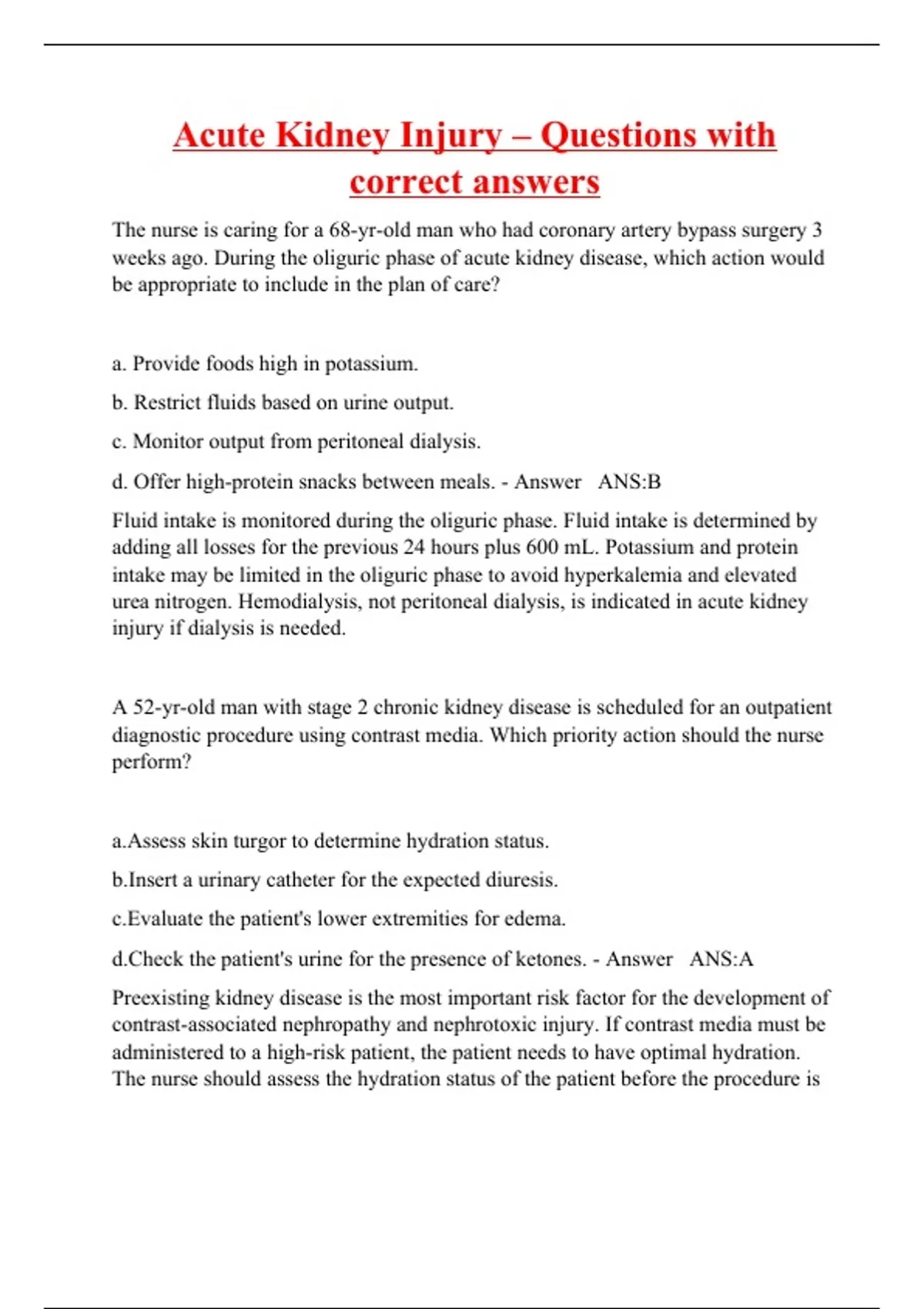 The nurse is caring for a 68-yr-old man who had coronary artery bypass surgery 3 weeks ago. During the oliguric phase of acute kidney disease, which action would be appropriate to include in the plan of care? a. Provide foods high in potassium. b. Restrict fluids based on urine output. c. Monitor output from peritoneal dialysis. d. Offer high-protein snacks between meals. - Answer ANS:B Fluid intake is monitored during the oliguric phase. Fluid intake is determined by adding all losses for the previous 24 hours plus 600 mL. Potassium and protein intake may be limited in the oliguric phase to avoid hyperkalemia and elevated urea nitrogen. Hemodialysis, not peritoneal dialysis, is indicated in acute kidney injury if dialysis is needed. A 52-yr-old man with stage 2 chronic kidney disease is scheduled for an outpatient diagnostic procedure using contrast media. Which priority action should the nurse perform? a.Assess skin turgor to determine hydration status. b.Insert a urinary catheter for the expected diuresis. c.Evaluate the patient's lower extremities for edema. d.Check the patient's urine for the presence of ketones. - Answer ANS:A Preexisting kidney disease is the most important risk factor for the development of contrast-associated nephropathy and nephrotoxic injury. If contrast media must be administered to a high-risk patient, the patient needs to have optimal hydration. The nurse should assess the hydration status of the patient before the procedure