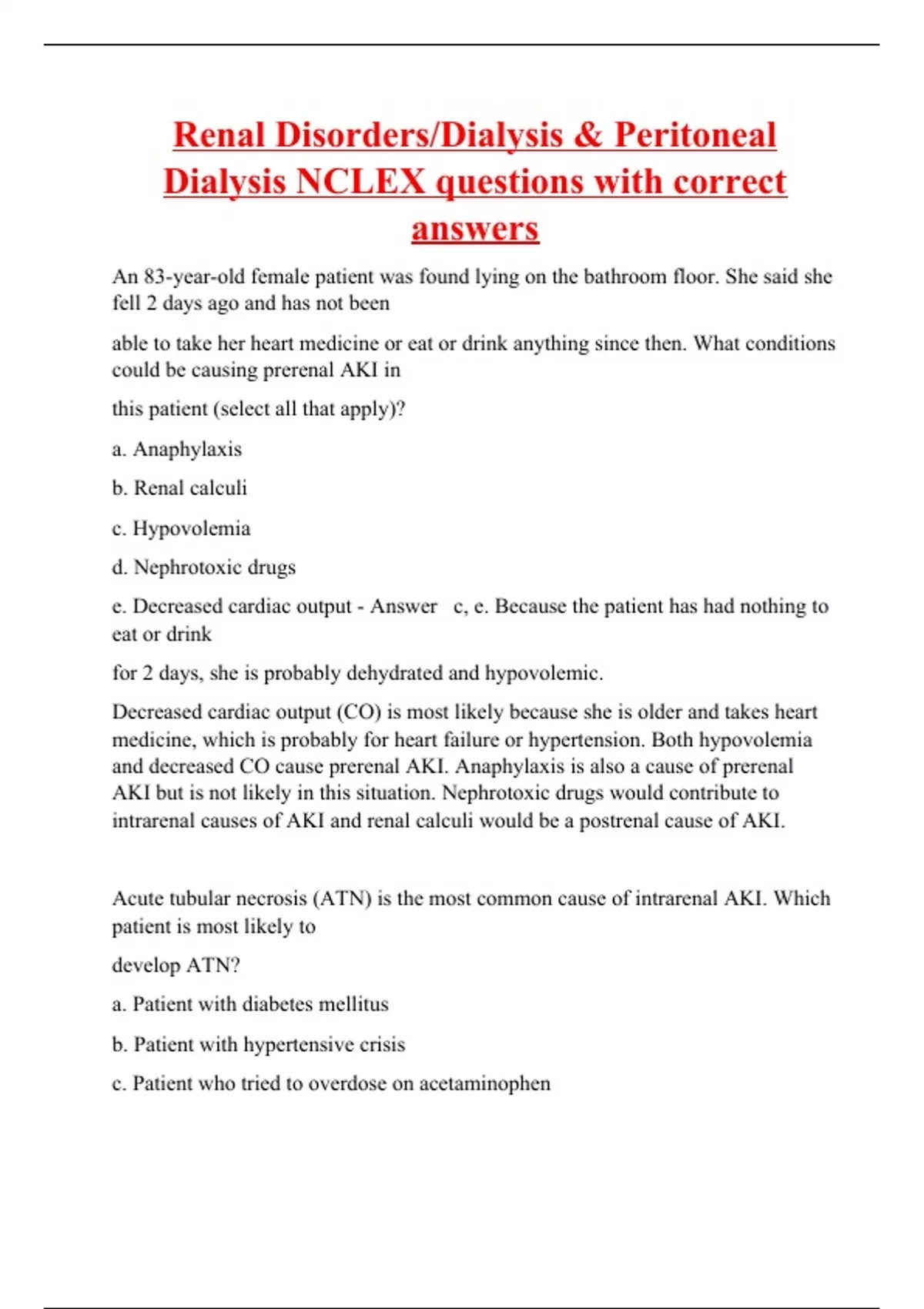 An 83-year-old female patient was found lying on the bathroom floor. She said she fell 2 days ago and has not been able to take her heart medicine or eat or drink anything since then. What conditions could be causing prerenal AKI in this patient (select all that apply)? a. Anaphylaxis b. Renal calculi c. Hypovolemia d. Nephrotoxic drugs e. Decreased cardiac output - Answer c, e. Because the patient has had nothing to eat or drink for 2 days, she is probably dehydrated and hypovolemic. Decreased cardiac output (CO) is most likely because she is older and takes heart medicine, which is probably for heart failure or hypertension. Both hypovolemia and decreased CO cause prerenal AKI. Anaphylaxis is also a cause of prerenal AKI but is not likely in this situation. Nephrotoxic drugs would contribute to intrarenal causes of AKI and renal calculi would be a postrenal cause of AKI. Acute tubular necrosis (ATN) is the most common cause of intrarenal AKI. Which patient is most likely to develop ATN? a. Patient with diabetes mellitus b. Patient with hypertensive crisis c. Patient who tried to overdose on acetaminophen