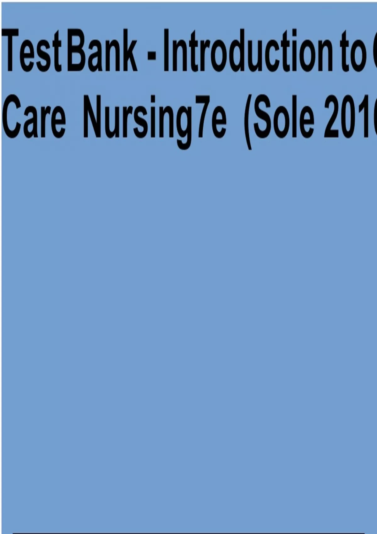 Test Bank - Introduction to Critical Care Nursing 7e (Sole 2016) / Introduction To Critical Care Nursing 7th Edition Test Bank Table of Contents Chapter 01: Overview of Critical Care Nursing Chapter 02: Patient and Family Response to the Critical Care Experience Chapter 03: Ethical and Legal Issues in Critical Care Nursing Chapter 04: Palliative and End-of-Life Care Chapter 05: Comfort and Sedation Chapter 06: Nutritional Therapy Chapter 07: Dysrhythmia Interpretation and Management Chapter 08: Hemodynamic Monitoring Chapter 09: Ventilatory Assistance Chapter 10: Rapid Response Teams and Code Management Chapter 11: Organ Donation Chapter 12: Shock, Sepsis, and Multiple Organ Dysfunction Syndrome Chapter 13: Cardiovascular Alterations Chapter 14: Nervous System Alterations Chapter 15: Acute Respiratory Failure Chapter 16: Acute Kidney Injury Chapter 17: Gastrointestinal Alterations Chapter 17: Hematological and Immune Disorders Chapter 19: Endocrine Alterations Chapter 20: Trauma and Surgical Management Chapter 21: Burns