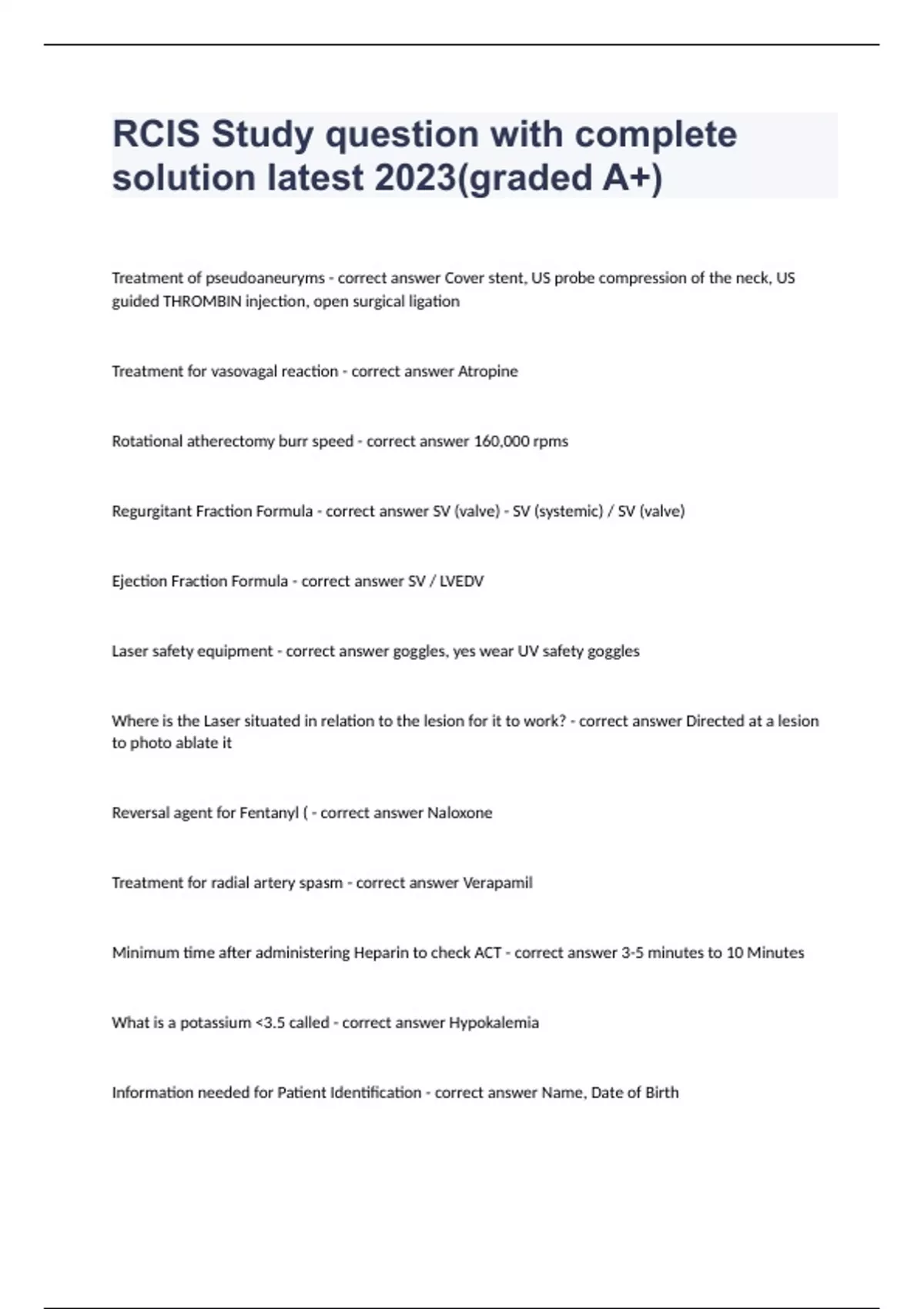 RCIS Study question with complete solution latest 2023(graded A+)Treatment of pseudoaneuryms - correct answer Cover stent, US probe compression of the neck, US guided THROMBIN injection, open surgical ligation Treatment for vasovagal reaction - correct answer Atropine Rotational atherectomy burr speed - correct answer 160,000 rpms Regurgitant Fraction Formula - correct answer SV (valve) - SV (systemic) / SV (valve) Ejection Fraction Formula - correct answer SV / LVEDV Laser safety equipment - correct answer goggles, yes wear UV safety goggles Where is the Laser situated in relation to the lesion for it to work? - correct answer Directed at a lesion to photo ablate it Reversal agent for Fentanyl ( - correct answer Naloxone Treatment for radial artery spasm - correct answer Verapamil Minimum time after administering Heparin to check ACT - correct answer 3-5 minutes to 10 Minutes What is a potassium 3.5 called - correct answer Hypokalemia Information needed for Patient Identification - correct answer Name, Date of Birth