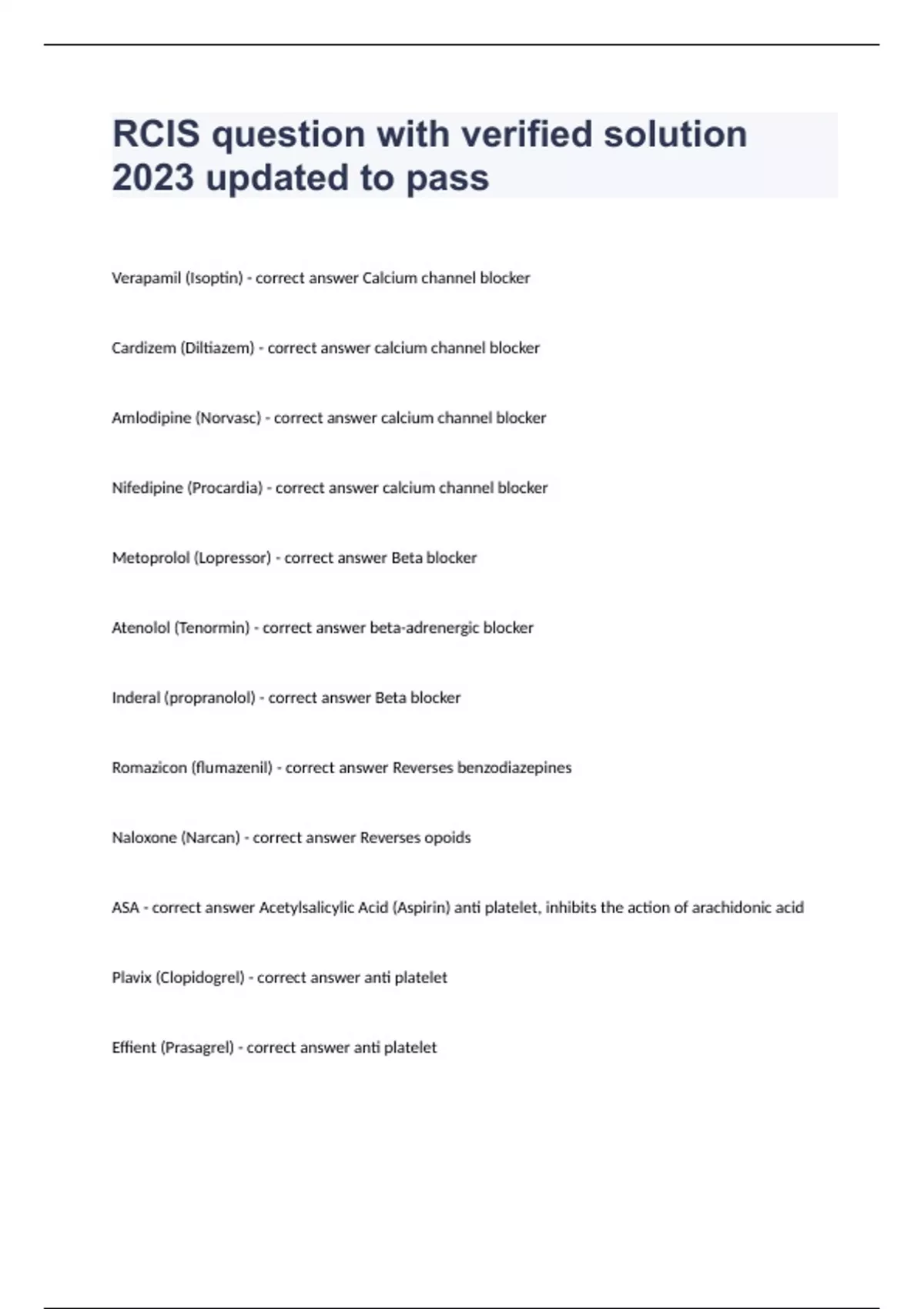 RCIS question with verified solution 2023 updated to passVerapamil (Isoptin) - correct answer Calcium channel blocker Cardizem (Diltiazem) - correct answer calcium channel blocker Amlodipine (Norvasc) - correct answer calcium channel blocker Nifedipine (Procardia) - correct answer calcium channel blocker Metoprolol (Lopressor) - correct answer Beta blocker Atenolol (Tenormin) - correct answer beta-adrenergic blocker Inderal (propranolol) - correct answer Beta blocker Romazicon (flumazenil) - correct answer Reverses benzodiazepines Naloxone (Narcan) - correct answer Reverses opoids ASA - correct answer Acetylsalicylic Acid (Aspirin) anti platelet, inhibits the action of arachidonic acid Plavix (Clopidogrel) - correct answer anti platelet Effient (Prasagrel) - correct answer anti platelet ReoPro (Abciximab) - correct answer Anti platelet, works on IIb/IIIa receptors Integrilin (Eptifibatide) - correct answer anti platelet Brilinta (ticagrelor) - correct answer anti platelet Heparin - correct answer Anticoagulant/ antithrombin, potentiates the action of antithrombin Angiomax (Bivalirudin) - correct answer Anti thrombin Coumadin (warfarin) - correct answer Anti thrombin Pradaxa (Dabigatran) - correct answer anti thrombin Lovenox (enoxaparin) - correct answer Anti thrombin Ancef (Cefazolin) - correct answer Narrow spectrum abx Vancomycin - correct answer Broad spectrum antibiotic Lisinopril - correct answer ACE inhibitor