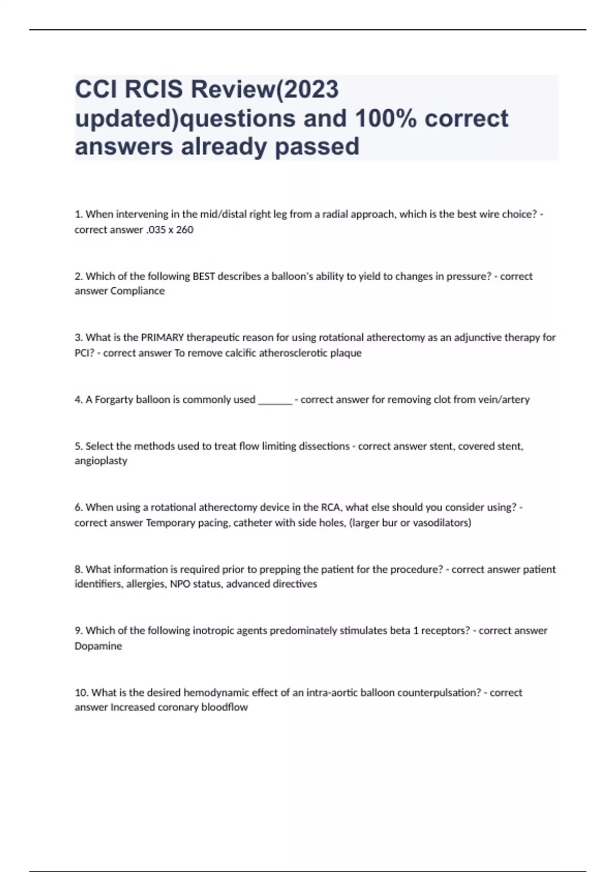 CCI RCIS Review(2023 updated)questions and 100% correct answers already passed1. When intervening in the mid/distal right leg from a radial approach, which is the best wire choice? - correct answer .035 x 260 2. Which of the following BEST describes a balloon's ability to yield to changes in pressure? - correct answer Compliance 3. What is the PRIMARY therapeutic reason for using rotational atherectomy as an adjunctive therapy for PCI? - correct answer To remove calcific atherosclerotic plaque 4. A Forgarty balloon is commonly used ______ - correct answer for removing clot from vein/artery 5. Select the methods used to treat flow limiting dissections - correct answer stent, covered stent, angioplasty 6. When using a rotational atherectomy device in the RCA, what else should you consider using? - correct answer Temporary pacing, catheter with side holes, (larger bur or vasodilators) 8. What information is required prior to prepping the patient for the procedure? - correct answer patient identifiers, allergies, NPO status, advanced directives 9. Which of the following inotropic agents predominately stimulates beta 1 receptors? - correct answer Dopamine 10. What is the desired hemodynamic effect of an intra-aortic balloon counterpulsation? - correct answer Increased coronary bloodflow