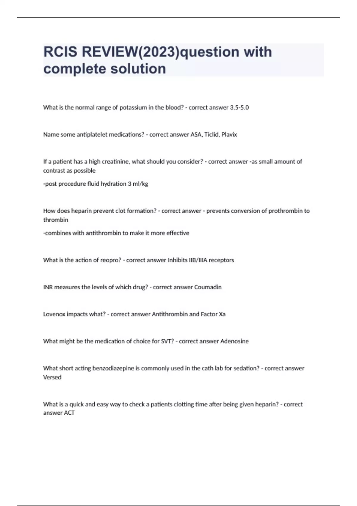 RCIS REVIEW(2023)question with complete solution What is the normal range of potassium in the blood? - correct answer 3.5-5.0 Name some antiplatelet medications? - correct answer ASA, Ticlid, Plavix If a patient has a high creatinine, what should you consider? - correct answer -as small amount of contrast as possible -post procedure fluid hydration 3 ml/kg How does heparin prevent clot formation? - correct answer - prevents conversion of prothrombin to thrombin -combines with antithrombin to make it more effective What is the action of reopro? - correct answer Inhibits IIB/IIIA receptors INR measures the levels of which drug? - correct answer Coumadin Lovenox impacts what? - correct answer Antithrombin and Factor Xa What might be the medication of choice for SVT? - correct answer Adenosine What short acting benzodiazepine is commonly used in the cath lab for sedation? - correct answer Versed What is a quick and easy way to check a patients clotting time after being given heparin? - correct answer ACT