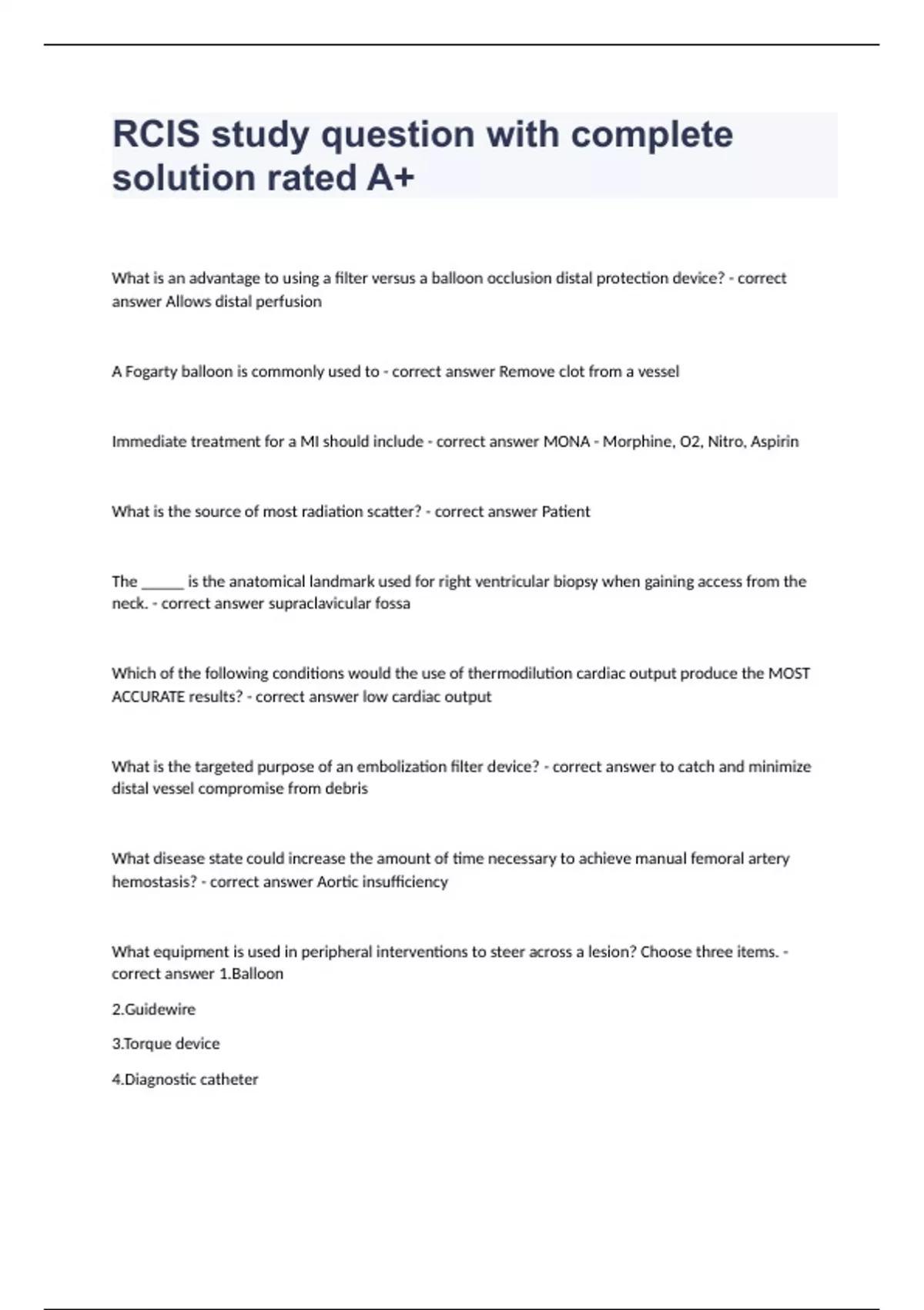 RCIS study question with complete solution rated A+What is an advantage to using a filter versus a balloon occlusion distal protection device? - correct answer Allows distal perfusion A Fogarty balloon is commonly used to - correct answer Remove clot from a vessel Immediate treatment for a MI should include - correct answer MONA - Morphine, O2, Nitro, Aspirin What is the source of most radiation scatter? - correct answer Patient The _____ is the anatomical landmark used for right ventricular biopsy when gaining access from the neck. - correct answer supraclavicular fossa Which of the following conditions would the use of thermodilution cardiac output produce the MOST ACCURATE results? - correct answer low cardiac output What is the targeted purpose of an embolization filter device? - correct answer to catch and minimize distal vessel compromise from debris What disease state could increase the amount of time necessary to achieve manual femoral artery hemostasis? - correct answer Aortic insufficiency What equipment is used in peripheral interventions to steer across a lesion? Choose three items. - correct answer 1.Balloon 2.Guidewire 3.Torque device 4.Diagnostic catheter