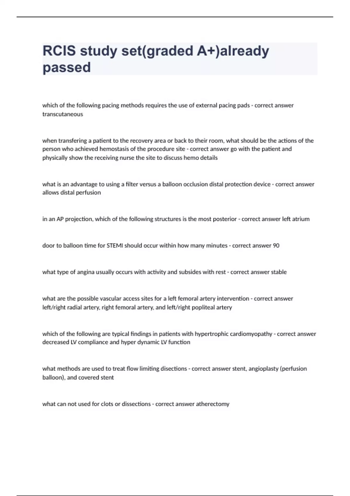 RCIS study set(graded A+)already passedwhich of the following pacing methods requires the use of external pacing pads - correct answer transcutaneous when transfering a patient to the recovery area or back to their room, what should be the actions of the person who achieved hemostasis of the procedure site - correct answer go with the patient and physically show the receiving nurse the site to discuss hemo details what is an advantage to using a filter versus a balloon occlusion distal protection device - correct answer allows distal perfusion in an AP projection, which of the following structures is the most posterior - correct answer left atrium door to balloon time for STEMI should occur within how many minutes - correct answer 90 what type of angina usually occurs with activity and subsides with rest - correct answer stable what are the possible vascular access sites for a left femoral artery intervention - correct answer left/right radial artery, right femoral artery, and left/right popliteal artery which of the following are typical findings in patients with hypertrophic cardiomyopathy - correct answer decreased LV compliance and hyper dynamic LV function what methods are used to treat flow limiting disections - correct answer stent, angioplasty (perfusion balloon), and covered stent what can not used for clots or dissections - correct answer atherectomy which of the following hemodynamic abnormalities would be observed with mitral stenosis - correct answer large "a" wave in the left atrium which of the following can be used to assure good stent apposition in PCI - correct answer intravascular ultrasound (IVUS) which vascular closure device has a suture that is self tightening - correct answer angioseal which atherectomy catheters shave and sand away plaque - correct answer orbital and directional which of the following conditions would invalidate Fick cardiac output results - correct answer atrial septal defect (ASD) what type of balloon catheter should be used to treat fibrotic plaque and neointimal hyperplasia - correct answer scoring which of the listed signs and symptoms may indicate a vasovagal response - correct answer nausea, bradycardia, hypotension, and pale skin what information is required prior to prepping a patient for the procedure - correct answer NPO status, patient allergies, patient identifiers and advanced directive when educating a patient about their hemostasis site after either a radial or femoral approach, which of the following points must be made - correct answer keep the bandage on the site for 24 hours, do not submerge the site in water for 48 hours, do not bend the affected area during your recovery bed rest, and no strenuous movement or heavy lifting for 24 hours eximer lasers are primarily used to treat which types of lesions - correct answer bifurcation, heavily calcified, and chronic total occlusions