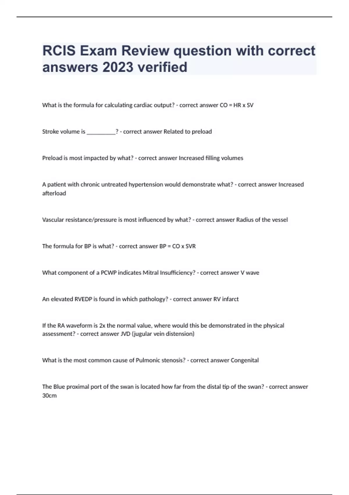 RCIS Exam Review question with correct answers 2023 verifiedWhat is the formula for calculating cardiac output? - correct answer CO = HR x SV Stroke volume is _________? - correct answer Related to preload Preload is most impacted by what? - correct answer Increased filling volumes A patient with chronic untreated hypertension would demonstrate what? - correct answer Increased afterload Vascular resistance/pressure is most influenced by what? - correct answer Radius of the vessel The formula for BP is what? - correct answer BP = CO x SVR What component of a PCWP indicates Mitral Insufficiency? - correct answer V wave An elevated RVEDP is found in which pathology? - correct answer RV infarct If the RA waveform is 2x the normal value, where would this be demonstrated in the physical assessment? - correct answer JVD (jugular vein distension) What is the most common cause of Pulmonic stenosis? - correct answer Congenital The Blue proximal port of the swan is located how far from the distal tip of the swan? - correct answer 30cm