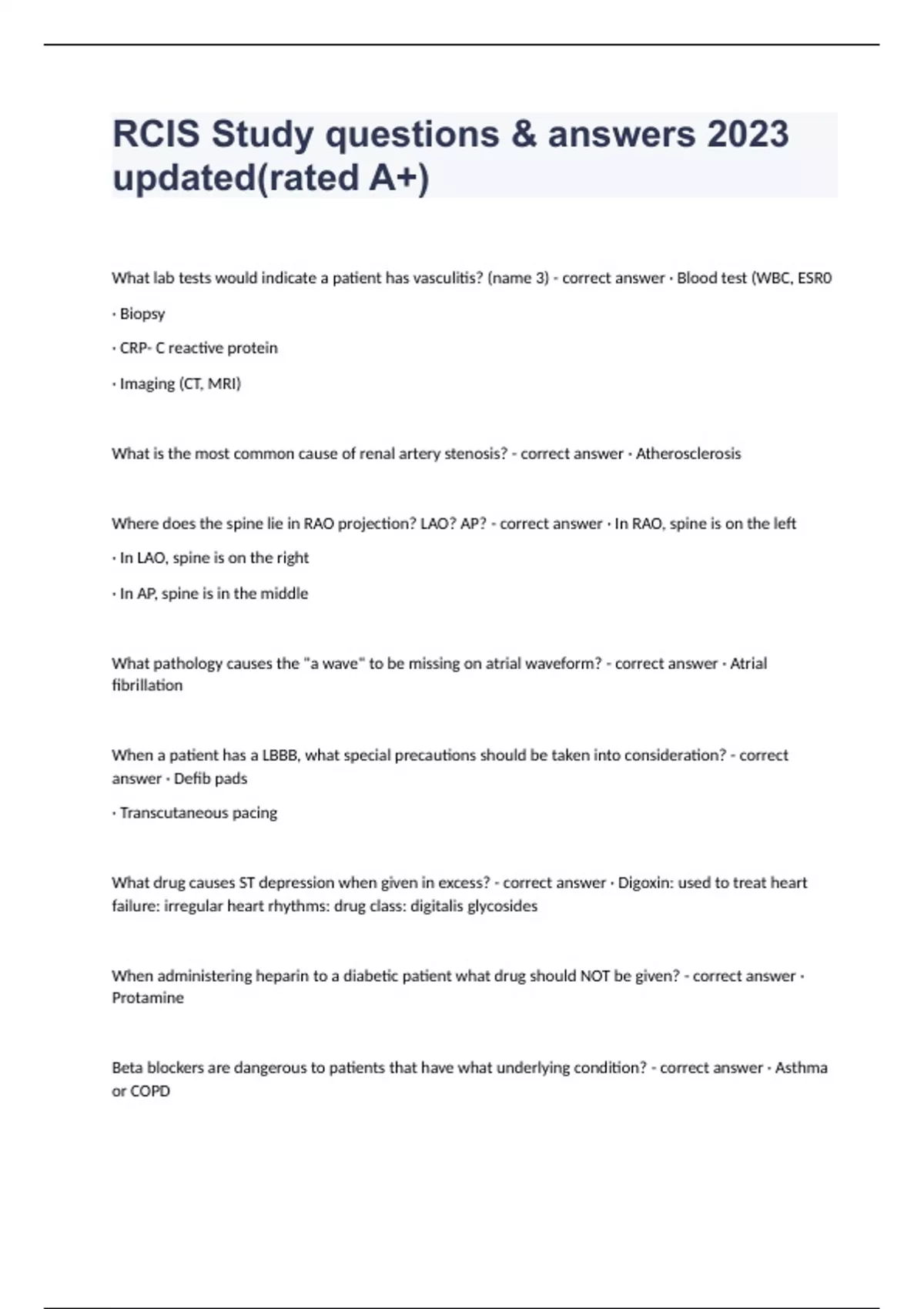 RCIS Study questions & answers 2023 updated(rated A+) What lab tests would indicate a patient has vasculitis? (name 3) - correct answer · Blood test (WBC, ESR0 · Biopsy · CRP- C reactive protein · Imaging (CT, MRI) What is the most common cause of renal artery stenosis? - correct answer · Atherosclerosis Where does the spine lie in RAO projection? LAO? AP? - correct answer · In RAO, spine is on the left · In LAO, spine is on the right · In AP, spine is in the middle What pathology causes the "a wave" to be missing on atrial waveform? - correct answer · Atrial fibrillation When a patient has a LBBB, what special precautions should be taken into consideration? - correct answer · Defib pads · Transcutaneous pacing What drug causes ST depression when given in excess? - correct answer · Digoxin: used to treat heart failure: irregular heart rhythms: drug class: digitalis glycosides When administering heparin to a diabetic patient what drug should NOT be given? - correct answer · Protamine Beta blockers are dangerous to patients that have what underlying condition? - correct answer · Asthma or COPD If RFA access is not attainable for an intervention on the LFA, what is the next best access site? - correct answer · Popliteal arteries What are the negative effects of having a patient in trendelenburg position for a prolonged period of time? - correct answer · risk of hemodynamic compromise · elevated intercranial pressure · impaired lung mechanics Name some negative side effects of leaving an IVC filter in too long? - correct answer · Device migration · Filter fracture · Perf of IVC · Embolization of the device to the heart and lungs What is an absolute contraindication for IABP? - correct answer · Aortic valve insufficiency · Dissecting aortic aneurysm · Aortic wall disease What is the best parameter for evaluating cardiac output in a patient with low EF? - correct answer · Fick formula Anaphylaxis presents itself in what ways? - correct answer · Rash · Brady · Clammy skin · Fast breathing Coarctation of the aorta has what effect on the LV? - correct answer · Coartation= narrowing of a small section of the aorta · BP increases which may cause the LV to thicken