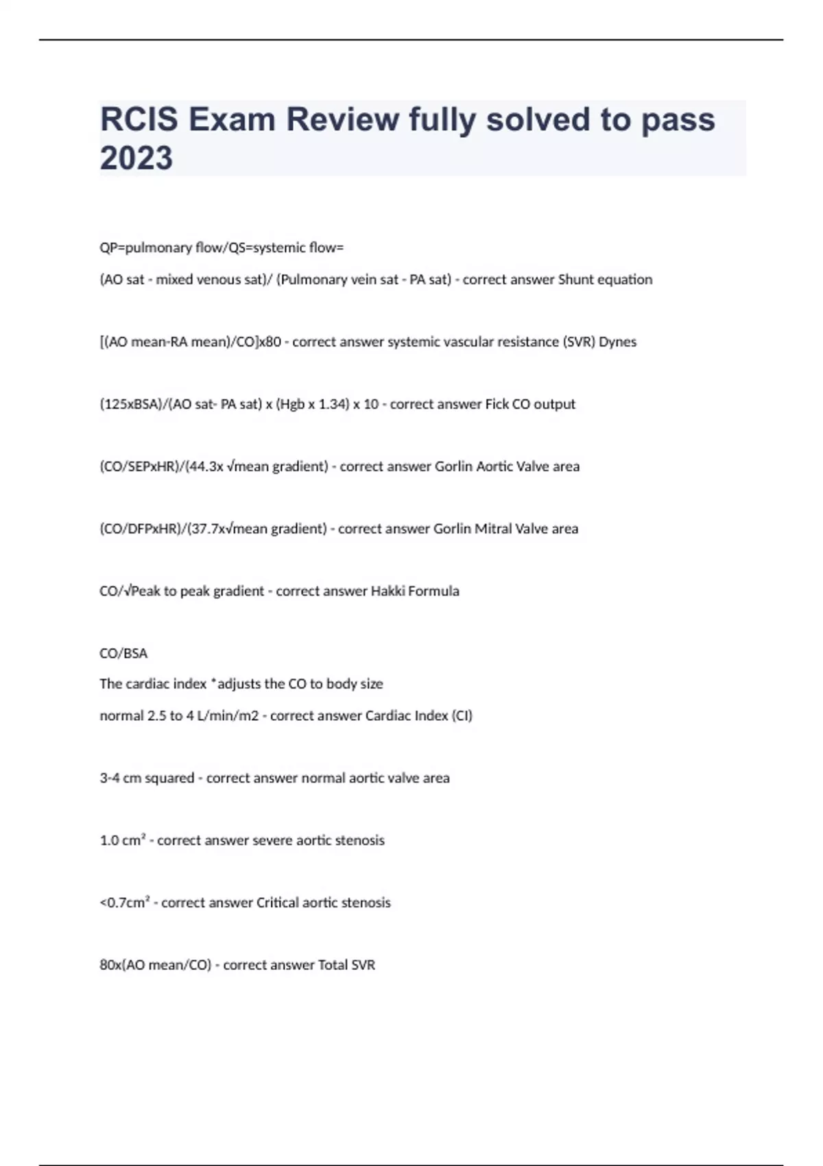 RCIS Exam Review fully solved to pass 2023 QP=pulmonary flow/QS=systemic flow= (AO sat - mixed venous sat)/ (Pulmonary vein sat - PA sat) - correct answer Shunt equation [(AO mean-RA mean)/CO]x80 - correct answer systemic vascular resistance (SVR) Dynes (125xBSA)/(AO sat- PA sat) x (Hgb x 1.34) x 10 - correct answer Fick CO output (CO/SEPxHR)/(44.3x √mean gradient) - correct answer Gorlin Aortic Valve area (CO/DFPxHR)/(37.7x√mean gradient) - correct answer Gorlin Mitral Valve area CO/√Peak to peak gradient - correct answer Hakki Formula CO/BSA The cardiac index *adjusts the CO to body size normal 2.5 to 4 L/min/m2 - correct answer Cardiac Index (CI) 3-4 cm squared - correct answer normal aortic valve area 1.0 cm² - correct answer severe aortic stenosis 0.7cm² - correct answer Critical aortic stenosis 80x(AO mean/CO) - correct answer Total SVR (AO mean - RA mean)/CO - correct answer SVR wood units [(PA mean-PCW mean)/CO]x80 - correct answer Pulmonary Vascular Resistance(PVR) in dynes 80x(PA mean/CO) - correct answer Total PVR (PA mean-PCW mean)/CO - correct answer PVR wood units 900-1500 dyne/sec/cm^5 9-20 wood units - correct answer Normal SVR value 20-130 dyne/sec/cm^5 0.25-1.6 wood units - correct answer Normal PVR value 1 1=left to right shunt 1=right to ledt shunt - correct answer Normal Qp/Qs