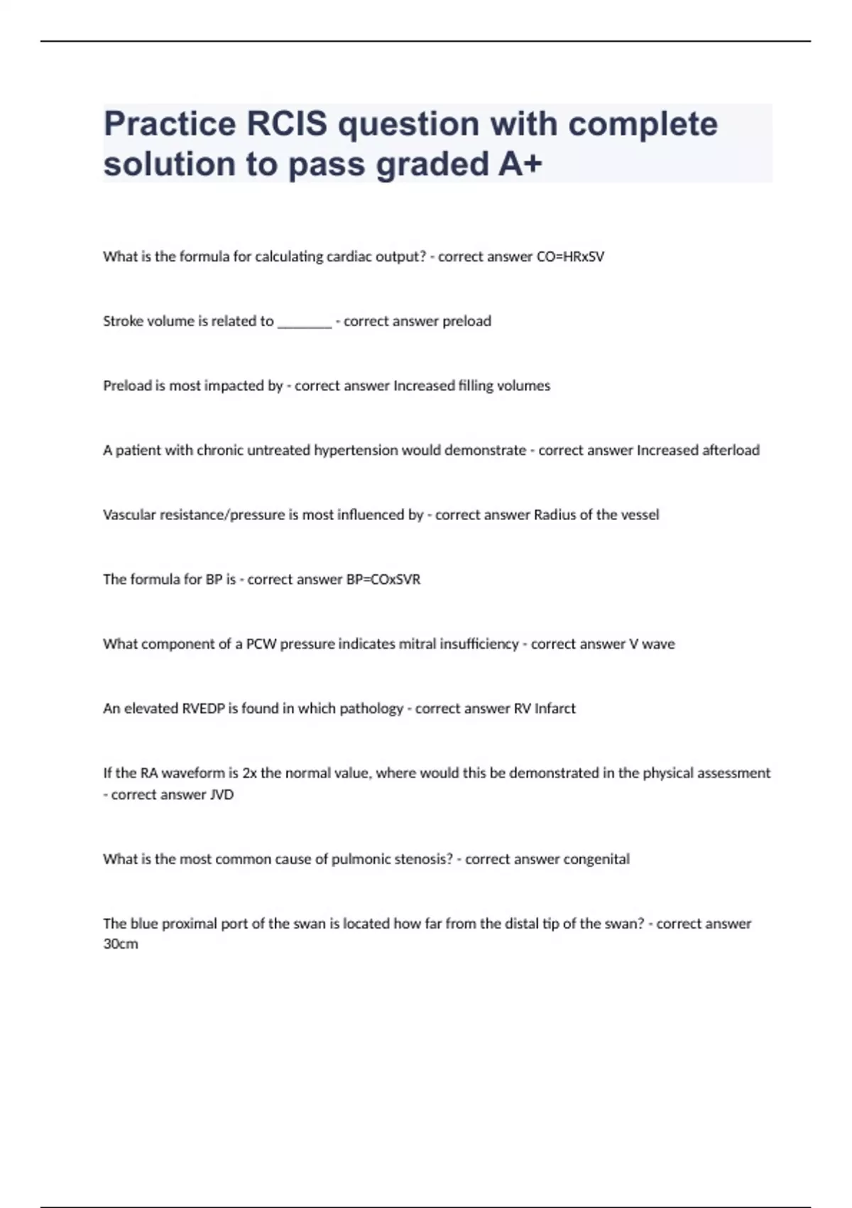 Practice RCIS question with complete solution to pass graded A+ What is the formula for calculating cardiac output? - correct answer CO=HRxSV Stroke volume is related to _______ - correct answer preload Preload is most impacted by - correct answer Increased filling volumes A patient with chronic untreated hypertension would demonstrate - correct answer Increased afterload Vascular resistance/pressure is most influenced by - correct answer Radius of the vessel The formula for BP is - correct answer BP=COxSVR What component of a PCW pressure indicates mitral insufficiency - correct answer V wave An elevated RVEDP is found in which pathology - correct answer RV Infarct If the RA waveform is 2x the normal value, where would this be demonstrated in the physical assessment - correct answer JVD What is the most common cause of pulmonic stenosis? - correct answer congenital The blue proximal port of the swan is located how far from the distal tip of the swan? - correct answer 30cm