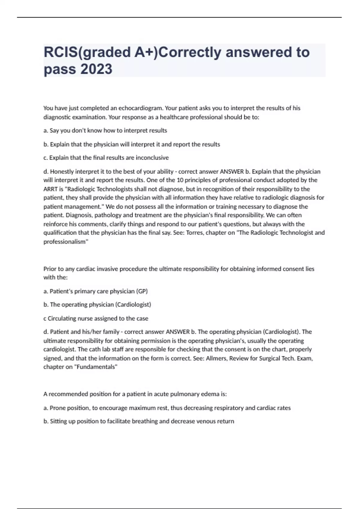 RCIS(graded A+)Correctly answered to pass 2023You have just completed an echocardiogram. Your patient asks you to interpret the results of his diagnostic examination. Your response as a healthcare professional should be to: a. Say you don't know how to interpret results b. Explain that the physician will interpret it and report the results c. Explain that the final results are inconclusive d. Honestly interpret it to the best of your ability - correct answer ANSWER b. Explain that the physician will interpret it and report the results. One of the 10 principles of professional conduct adopted by the ARRT is "Radiologic Technologists shall not diagnose, but in recognition of their responsibility to the patient, they shall provide the physician with all information they have relative to radiologic diagnosis for patient management." We do not possess all the information or training necessary to diagnose the patient. Diagnosis, pathology and treatment are the physician's final responsibility. We can often reinforce his comments, clarify things and respond to our patient's questions, but always with the qualification that the physician has the final say. See: Torres, chapter on "The Radiologic Technologist and professionalism" Prior to any cardiac invasive procedure the ultimate responsibility for obtaining informed consent lies with the: a. Patient's primary care physician (GP) b. The operating physician (Cardiologist) c Circulating nurse assigned to the case d. Patient and his/her family - correct answer ANSWER b. The operating physician (Cardiologist). The ultimate responsibility for obtaining permission is the operating physician's, usually the operating cardiologist. The cath lab staff are responsible for checking that the consent is on the chart, properly signed, and that the information on the form is correct. See: Allmers, Review for Surgical Tech. Exam, chapter on "Fundamentals" A recommended position for a patient in acute pulmonary edema is: a. Prone position, to encourage maximum rest, thus decreasing respiratory and cardiac rates b. Sitting up position to facilitate breathing and decrease venous return c. Trendelenburg position, to drain blood from leg veins into the heart . d. Recovery position, lateral with upper leg flexed and forward, and upper hand across the chest with back of hand held supporting his cheek. - correct answer ANSWER b. Sitting up position to facilitate breathing and decrease venous return. A patient with dyspnea is usually uncomfortable in a lying supine position (orthopnea). This is because gravity increases fluid in the lungs which increases edema in CHF patients. They often have less difficulty breathing when placed in either a semi- sitting (mid- Fowler's) position 30o, sitting (high- Fowler's) position 45o, or reverse Trendelenburg position (body tilted head up). See: Medical Dictionary When charting in the medical record you should: a. Avoid generalizations like "appears, inadvertently, seems to..." b. Avoid writing with fountain pens with liquid ink c. Avoid documenting routine safety measures d. Chart care as you are planning it, not after it is given - correct answer ANSWER a. Avoid generalizations like "appears, inadvertently, seems to..." Kern says: "Information in the medical record should reflect only accurate facts regarding the particular patient. Avoid generalizations and speculating by charting only what you see, hear, feel, and smell. Do not use words such as inadvertently, unfortunately, appears, resembles, and the like.... Chart after the delivery of care, not before. Never make an entry in anticipation of something to be done...The chart note should identify precautionary or protective measures that have been taken for the safety of the patient, including the use of side rails and restraints." Charting should always be done with a permanent ink pen, although especially runny ink may smear. See: Kern, chapter on "Documentation in the Cardiac Catheterization Laboratory" To be legally valid, what is the LATEST that the patient should sign the informed consent form? a. Before administration of preoperative medications (such as demerol) b. Before administration of conscious sedation (such as Versed) c Before any invasive incisions or percutaneous punctures are made d. Before any interventions are made (PTCA, Stent...) - correct answer ANSWER a. Before administration of preoperative medications. Consent forms must be signed before the administration of preoperative medications. This is to ensure that the patient fully understands and is informed about the procedure and the risks involved. If his mind is clouded by preoperative medications such as demerol the consent is not legally valid. See: Allmers, Review for Surgical Tech. Exam, chapter on "Fundamentals" A patient's informed consent: a. Authorizes all routine hospital procedures b. Protects patient from high risk procedures .c Protects the operating physician and
