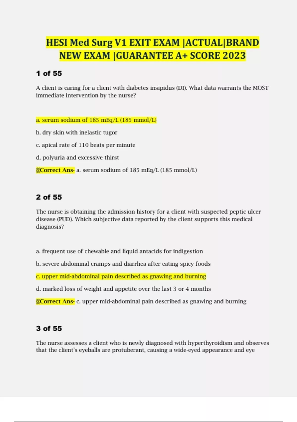 HESI Med Surg V1 EXIT EXAM |ACTUAL|BRAND NEW EXAM |GUARANTEE A+ SCORE 2023 1 of 55 A client is caring for a client with diabetes insipidus (DI). What data warrants the MOST immediate intervention by the nurse? a. serum sodium of 185 mEq/L (185 mmol/L) b. dry skin with inelastic tugor c. apical rate of 110 beats per minute d. polyuria and excessive thirst {{Correct Ans- a. serum sodium of 185 mEq/L (185 mmol/L) 2 of 55 The nurse is obtaining the admission history for a client with suspected peptic ulcer disease (PUD). Which subjective data reported by the client supports this medical diagnosis? a. frequent use of chewable and liquid antacids for indigestion b. severe abdominal cramps and diarrhea after eating spicy foods c. upper mid-abdominal pain described as gnawing and burning d. marked loss of weight and appetite over the last 3 or 4 months {{Correct Ans- c. upper mid-abdominal pain described as gnawing and burning 3 of 55 The nurse assesses a client who is newly diagnosed with hyperthyroidism and observes that the client's eyeballs are protuberant, causing a wide-eyed appearance and eye discomfort. Based on this finding, which action should the nurse include in this client's plan of care? a. assess for signs of increased intracranial pressure b. prepare to administer levothyroxine c. review the client's serum electrolyte values d. obtain a prescription for artificial tear drops {{Correct Ans- d. obtain a prescription for artificial tear drops 4 of 55 To reduce the risk for pulmonary complication for a patient with Amyotrophic Lateral Sclerosis (ALS), which interventions should the nurse implement? (Select all that apply.) a. perform chest physiotherapy b. teach the client breathing exercises c. initiate passive range of motion exercises d. establish a regular bladder routine e. encourage use of incentive spirometer {{Correct Ans- a. perform chest physiotherapy b. teach the client breathing exercises e. encourage use of incentive spirometer 5 of 55 A client is hospitalized with heart failure (HF). Which intervention should the nurse implement to improve ventilation and reduce venous return? a. perform passive range of motion b. place the client in a high Fowler position c. administer oxygen per nasal cannula d. increase the client's activity level {{Correct Ans- b. place the client in a high Fowler position