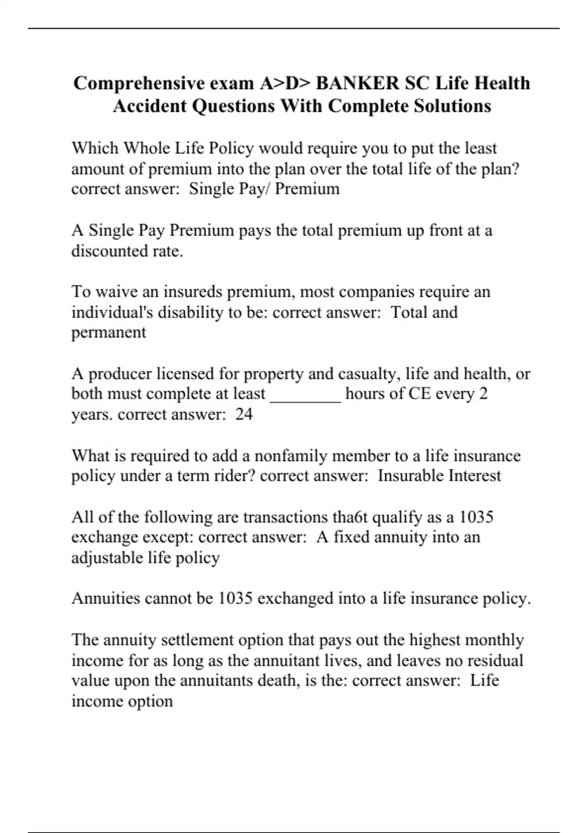 Which Whole Life Policy would require you to put the least amount of premium into the plan over the total life of the plan? correct answer: Single Pay/ Premium A Single Pay Premium pays the total premium up front at a discounted rate. To waive an insureds premium, most companies require an individual's disability to be: correct answer: Total and permanent A producer licensed for property and casualty, life and health, or both must complete at least ________ hours of CE every 2 years. correct answer: 24 What is required to add a nonfamily member to a life insurance policy under a term rider? correct answer: Insurable Interest All of the following are transactions tha6t qualify as a 1035 exchange except: correct answer: A fixed annuity into an adjustable life policy Annuities cannot be 1035 exchanged into a life insurance policy. The annuity settlement option that pays out the highest monthly income for as long as the annuitant lives, and leaves no residual value upon the annuitants death, is the: correct answer: Life income option