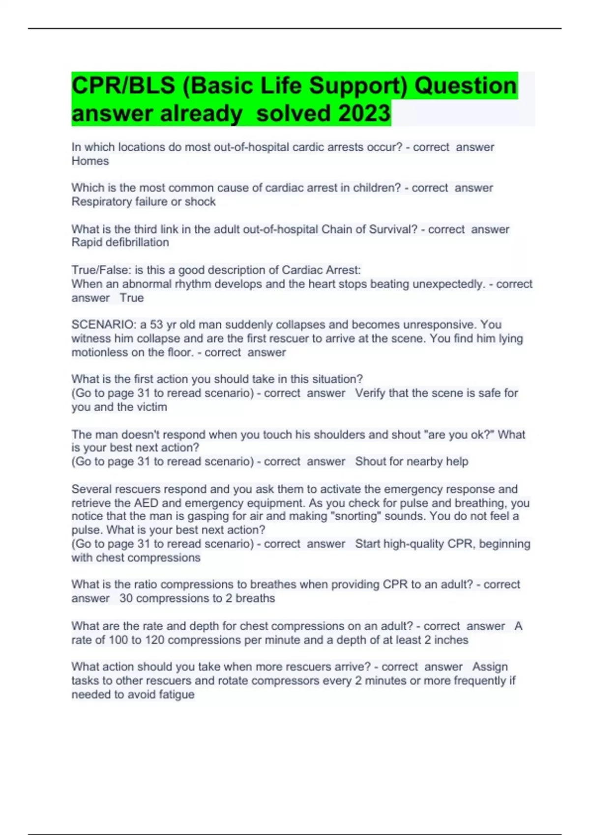 CPR/BLS (Basic Life Support) Question answer already solved 2023In which locations do most out-of-hospital cardic arrests occur? Homes Which is the most common cause of cardiac arrest in children? Respiratory failure or shock What is the third link in the adult out-of-hospital Chain of Survival? Rapid defibrillation True/False: is this a good description of Cardiac Arrest: When an abnormal rhythm develops and the heart stops beating unexpectedly. True SCENARIO: a 53 yr old man suddenly collapses and becomes unresponsive. You witness him collapse and are the first rescuer to arrive at the scene. You find him lying motionless on the floor. ... What is the first action you should take in this situation? (Go to page 31 to reread scenario) Verify that the scene is safe for you and the victim The man doesn't respond when you touch his shoulders and shout "are you ok?" What is your best next action? (Go to page 31 to reread scenario) Shout for nearby help Several rescuers respond and you ask them to activate the emergency response and retrieve the AED and emergency equipment. As you check for pulse and breathing, you notice that the man is gasping for air and making "snorting" sounds. You do not feel a pulse. What is your best next action? (Go to page 31 to reread scenario) Start high-quality CPR, beginning with chest compressions What is the ratio compressions to breathes when providing CPR to an adult? 30 compressions to 2 breaths What are the rate and depth for chest compressions on an adult? A rate of 100 to 120 compressions per minute and a depth of at least 2 inches What action should you take when more rescuers arrive? Assign tasks to other rescuers and rotate compressors every 2 minutes or more frequently if needed to avoid fatigue If you suspect that an unresponsive victim has head or neck trauma, what is the preferred method for opening the airway? Jaw thrust What is the most. Appropriate first step to take as soon as AED arrives at the scene? Power on the AED What step is one of the universal steps for operating an AED? Placing the pads on victims bare chest If a victim of cardiac arrest has an implanted pacemaker or defibrillator, what special steps should be taken? Avoid placing the AED pad directly over the implanted device What action should you take when AED is analyzing the heart rhythm? Stand clear of the victim After performing high-quality CPR for 5 minutes, the team leader frequently interrupts chest compressions to check for a pulse even though the victim has no organized rhythm when AED analyzes the rhythm. What action demonstrates constructive intervention? Suggest to resume chest compressions without delay The team leader asks you to preform bag-mask ventilation during a resuscitation attempt, but you have not perfected that skill. What would be an appropriate action to acknowledge your limitations? Tell the team leader th
