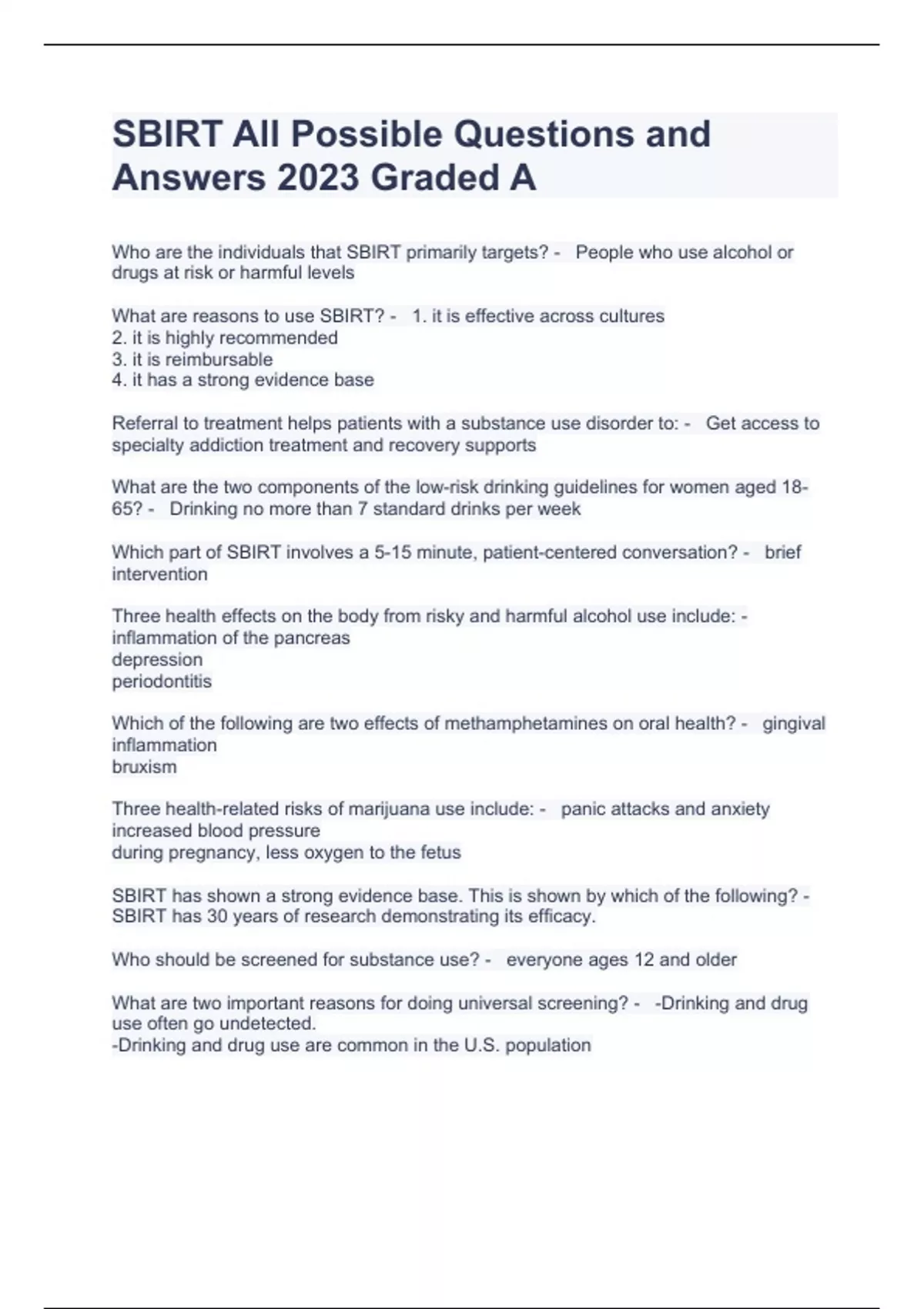 SBIRT All Possible Questions and Answers 2023 Graded A
