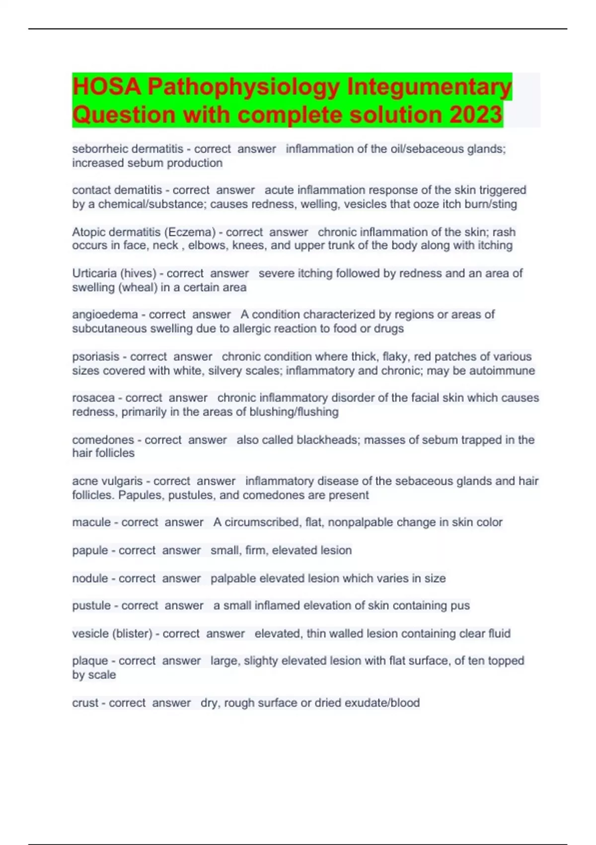 HOSA Pathophysiology Integumentary Question with complete solution 2023seborrheic dermatitis inflammation of the oil/sebaceous glands; increased sebum production contact dematitis acute inflammation response of the skin triggered by a chemical/substance; causes redness, welling, vesicles that ooze itch burn/sting Atopic dermatitis (Eczema) chronic inflammation of the skin; rash occurs in face, neck , elbows, knees, and upper trunk of the body along with itching Urticaria (hives) severe itching followed by redness and an area of swelling (wheal) in a certain area angioedema A condition characterized by regions or areas of subcutaneous swelling due to allergic reaction to food or drugs psoriasis chronic condition where thick, flaky, red patches of various sizes covered with white, silvery scales; inflammatory and chronic; may be autoimmune rosacea chronic inflammatory disorder of the facial skin which causes redness, primarily in the areas of blushing/flushing comedones also called blackheads; masses of sebum trapped in the hair follicles acne vulgaris inflammatory disease of the sebaceous glands and hair follicles. Papules, pustules, and comedones are present macule A circumscribed, flat, nonpalpable change in skin color papule small, firm, elevated lesion nodule palpable elevated lesion which varies in size pustule a small inflamed elevation of skin containing pus vesicle (blister) elevated, thin walled lesion containing clear fluid plaque large, slighty elevated lesion with flat surface, of ten topped by scale crust dry, rough surface or dried exudate/blood lichenification thick, dry, rough surface (leather like) keloid Abnormal growth of scar tissue that is thick and irregular fissure Crack in the skin that penetrates the epidermis, such as chapped hands or lips. ulcer A deep loss of skin surface that may extend into the dermis; may cause periodic bleeding and the formation of scars. erosion shallow, moist cavity in epidermis comedo mass of sebum, keratin and debris blocking the opening of a hair follicle herpes zoster (shingles) acute inflammatory dermatomal eruption of extremely painful vesicles; caused by VZV virus