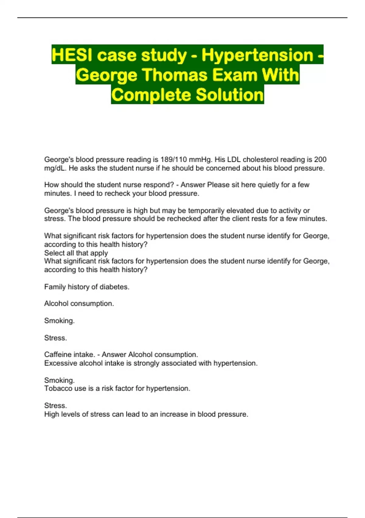 HESI case study - Hypertension - George Thomas Exam With Complete Solution
