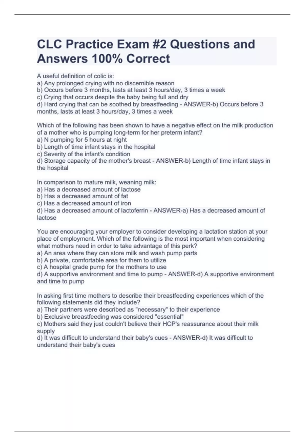 CLC Practice Exam #2 Questions and Answers 100% CorrectCLC Practice Exam #2 Questions and Answers 100% CorrectCLC Practice Exam #2 Questions and Answers 100% CorrectCLC Practice Exam #2 Questions and Answers 100% Correct A useful definition of colic is: a) Any prolonged crying with no discernible reason b) Occurs before 3 months, lasts at least 3 hours/day, 3 times a week c) Crying that occurs despite the baby being full and dry d) Hard crying that can be soothed by breastfeeding - ANSWER-b) Occurs before 3 months, lasts at least 3 hours/day, 3 times a week Which of the following has been shown to have a negative effect on the milk production of a mother who is pumping long-term for her preterm infant? a) N pumping for 5 hours at night b) Length of time infant stays in the hospital c) Severity of the infant's condition d) Storage capacity of the mother's breast - ANSWER-b) Length of time infant stays in the hospital In comparison to mature milk, weaning milk: a) Has a decreased amount of lactose b) Has a decreased amount of fat c) Has a decreased amount of iron d) Has a decreased amount of lactoferrin - ANSWER-a) Has a decreased amount of lactose You are encouraging your employer to consider developing a lactation station at your place of employment. Which of the following is the most important when considering what mothers need in order to take advantage of this perk? a) An area where they can store milk and wash pump parts b) A private, comfortable area for them to utilize c) A hospital grade pump for the mothers to use d) A supportive environment and time to pump - ANSWER-d) A supportive environment and time to pump In asking first time mothers to describe their breastfeeding experiences which of the following statements did they include? a) Their partners were described as "necessary" to their experience b) Exclusive breastfeeding was considered "essential" c) Mothers said they just couldn't believe their HCP's reassurance about their milk supply d) It was difficult to understand their baby's cues - ANSWER-d) It was difficult to understand their baby's cues