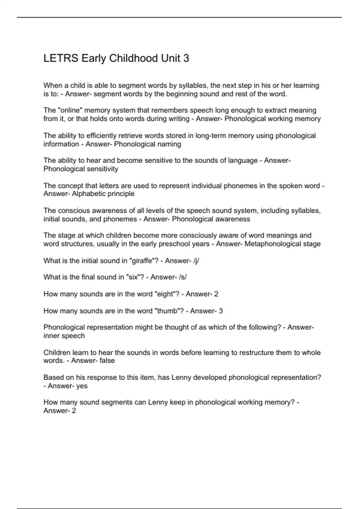 When a child is able to segment words by syllables, the next step in his or her learning is to: - Answer- segment words by the beginning sound and rest of the word. The "online" memory system that remembers speech long enough to extract meaning from it, or that holds onto words during writing - Answer- Phonological working memory The ability to efficiently retrieve words stored in long-term memory using phonological information - Answer- Phonological naming The ability to hear and become sensitive to the sounds of language - Answer- Phonological sensitivity The concept that letters are used to represent individual phonemes in the spoken word - Answer- Alphabetic principle The conscious awareness of all levels of the speech sound system, including syllables, initial sounds, and phonemes - Answer- Phonological awareness The stage at which children become more consciously aware of word meanings and word structures, usually in the early preschool years - Answer- Metaphonological stage What is the initial sound in "giraffe"? - Answer- /j/ What is the final sound in "six"? - Answer- /s/ How many sounds are in the word "eight"? - Answer- 2 How many sounds are in the word "thumb"? - Answer- 3 Phonological representation might be thought of as which of the following? - Answer- inner speech Children learn to hear the sounds in words before learning to restructure them to whole words. - Answer- false Based on his response to this item, has Lenny developed phonological representation? - Answer- yes How many sound segments can Lenny keep in phonological working memory? - Answer- 2 Which statements describe Lenn