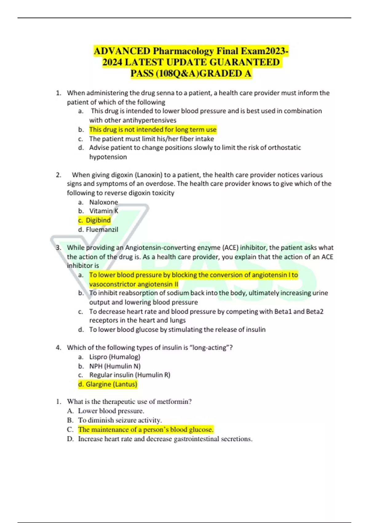 ADVANCED Pharmacology Final Exam LATEST UPDATE GUARANTEED PASS (108 Q&A)GRADED A When administering the drug senna to a patient, a health care provider must inform the patient of which of the following: ANS: The drug is not intended for long term use