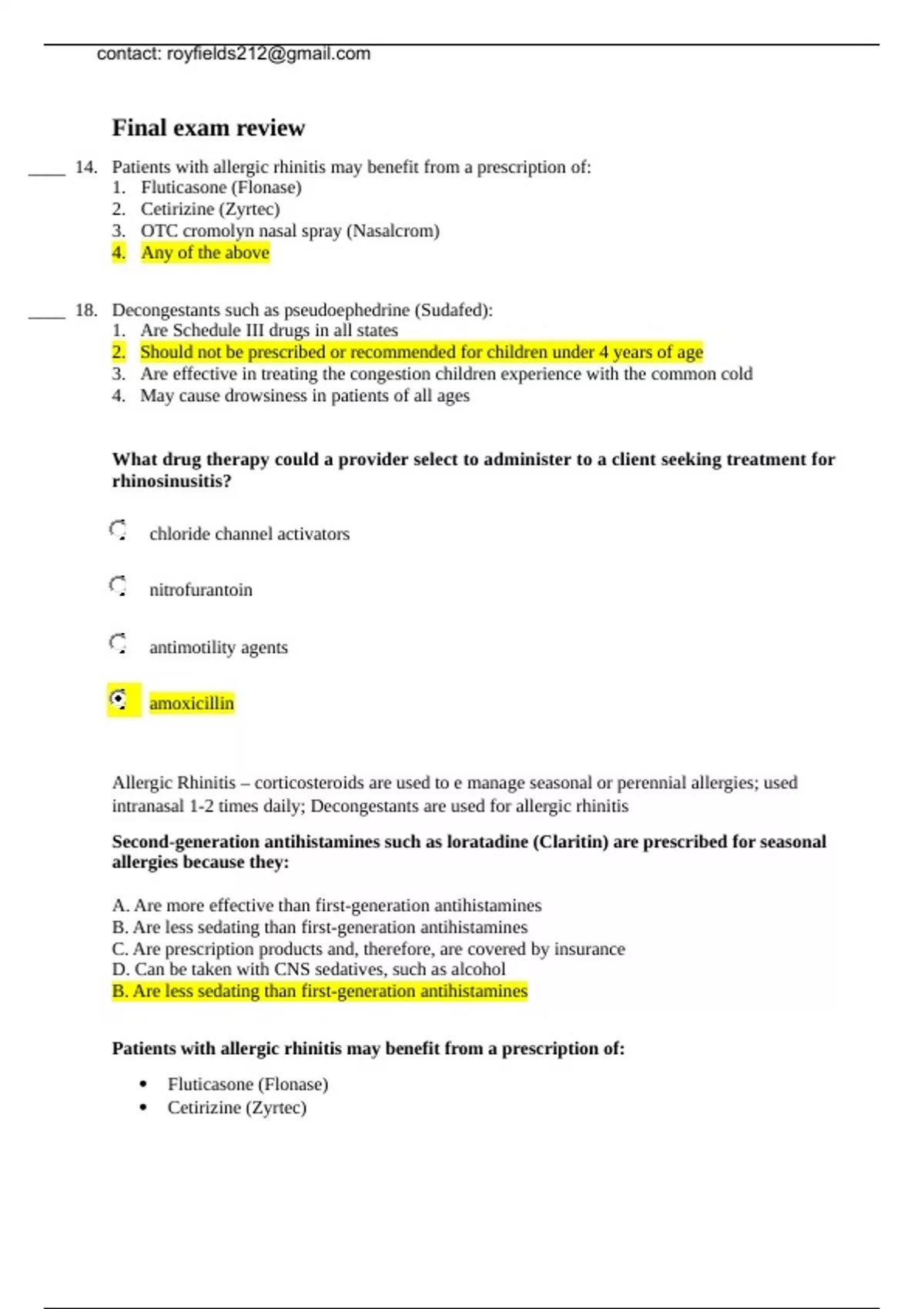 final exam review 14 patients with allergic rhinitis may benefit from a prescription of 1 fluticasone flonase 2 cetirizine zyrtec 3 otc cromolyn nasal spray nasalcrom 4 any of the abo