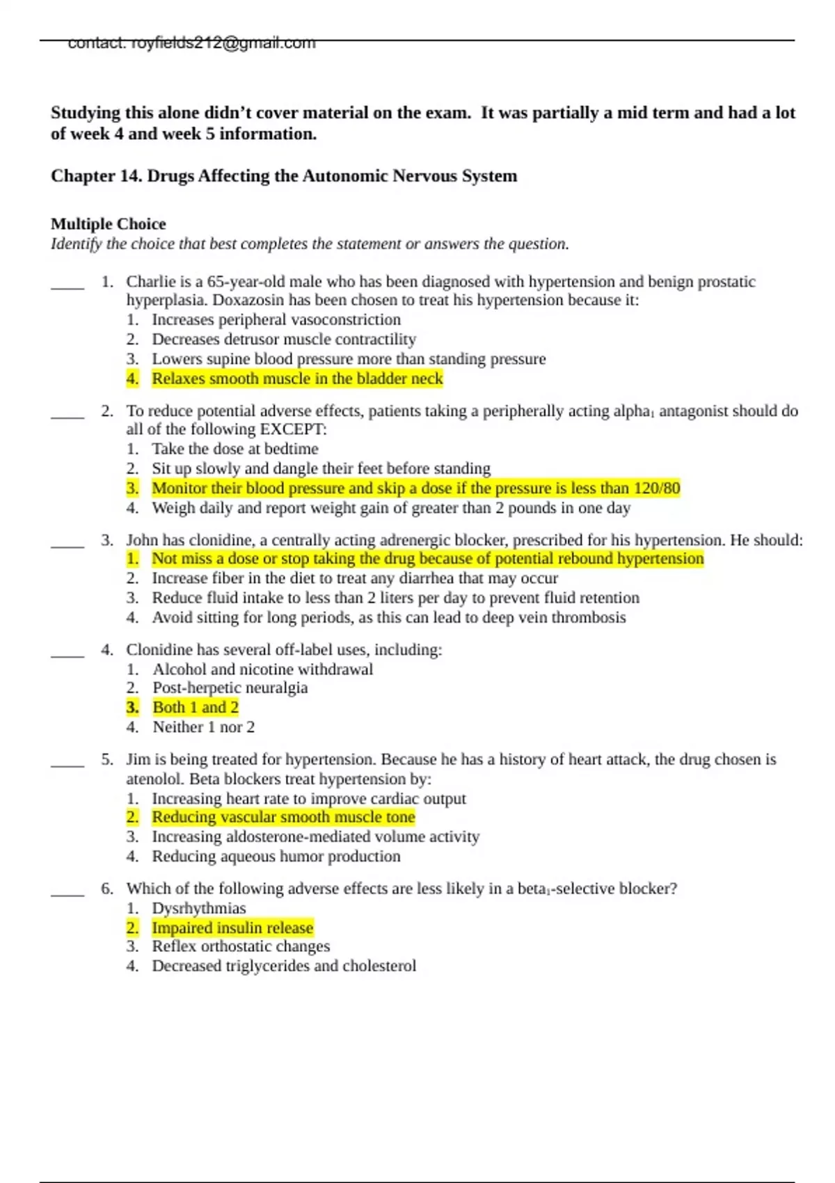 Chapter 14. Drugs Affecting the Autonomic Nervous System Multiple Choice Identify the choice that best completes the statement or answers the question. ____ 1. Charlie is a 65-year-old male who has been diagnosed with hypertension and benign prostatic hyperplasia. Doxazosin has been chosen to treat his hypertension because it: 1. Increases peripheral vasoconstriction 2. Decreases detrusor muscle contractility 3. Lowers supine blood pressure more than standing pressure 4. Relaxes smooth muscle in the bladder neck ____ 2. To reduce potential adverse effects, patients taking a peripherally acting alpha1 antagonist should do all of the following EXCEPT: 1. Take the dose at bedtime 2. Sit up slowly and dangle their feet before standing 3. Monitor their blood pressure and skip a dose if the pressure is less than 120/80 4. Weigh daily and report weight gain of greater than 2 pounds in one day ____ 3. John has clonidine, a centrally acting adrenergic blocker, prescribed for his hypertension. He should: 1. Not miss a dose or stop taking the drug because of potential rebound hypertension 2. Increase fiber in the diet to treat any diarrhea that may occur 3. Reduce fluid intake to less than 2 liters per day to prevent fluid retention 4. Avoid sitting for long periods, as this can lead to deep vein thrombosis ____ 4. Clonidine has several off-label uses, including: 1. Alcohol and nicotine withdrawal 2. Post-herpetic neuralgia 3. Both 1 and 2 4. Neither 1 nor 2 ____ 5. Jim is being treated for hypertension. Because he has a history of heart attack, the drug chosen is atenolol. Beta blockers treat hypertension by: 1. Increasing heart rate to improve cardiac output 2. Reducing vascular smooth muscle tone 3. Increasing aldosterone-mediated volume activity 4. Reducing aqueous humor production ____ 6. Which of the following adverse effects are less likely in a beta1-selective blocker? 1. Dysrhythmias 2. Impaired insulin release 3. Reflex orthostatic changes 4. Decreased triglycerides and cholesterol contact: ____ 7. Richard is 70 years old and has a history of cardiac dysrhythmias. He has been prescribed nadolol. You do his annual laboratory work and find a CrCl of 25 ml/min. What action should you take related to his nadolol? 1. Extend the dosage interval. 2. Decrease the dose by 75%. 3. Take no action because this value is expected in the older adult. 4. Schedule a serum creatinine level to validate the CrCl value. ____ 8. Beta blockers are the drugs of choice for exertional angina because they: 1. Improve myocardial oxygen supply by vasodilating the coronary arteries 2. Decrease myocardial oxygen demand by decreasing heart rate and vascular resistance 3. Both 1 and 2 4. Neither 1 nor 2 ____ 9. Adherence to beta blocker therapy may be affected by their: 1. Short half-lives requiring twice daily dosing 2. Tendency to elevate lipid levels 3. Effects on the male genitalia, which may produce impotence 4. None of the above ____ 10. Beta blockers have favorable effects on survival and disease progression in heart failure. Treatment should be initiated when the: 1. Symptoms are severe 2. Patient has not responded to other therapies 3. Patient has concurrent hypertension 4. Left ventricular dysfunction is diagnosed ____ 11. Abrupt withdrawal of beta blockers can be life threatening. Patients at highest risk for serious consequences of rapid withdrawal are those with: 1. Angina 2. Coronary artery disease 3. Both 1 and 2 4. Neither 1 nor 2 ____ 12. To prevent life-threatening events from rapid withdrawal of a beta blocker: 1. The dosage interval should be increased by 1 hour each day. 2. An alpha blocker should be added to the treatment regimen before withdrawal. 3. The dosage should be tapered over a period of weeks. 4. The dosage should be decreased by one-half every 4 days. ____ 13. Beta blockers are prescribed for diabetics with caution because of their ability to produce hypoglycemia and block the common symptoms of it. Which of the following symptoms of hypoglycemia is not blocked by these drugs and so can be used to warn diabetics of possible decreased blood glucose? 1. Dizziness 2. Increased heart rate 3. Nervousness and shakiness 4. Diaphoresis ____ 14. Combined alpha-beta antagonists are used to reduce the progression of heart failure because they: 1. Vasodilate the peripheral vasculature 2. Decrease cardiac output 3. Increase renal vascular resistance 4. Reduce atherosclerosis secondary to elevated serum lipoproteins ____ 15. Carvedilol is heavily metabolized by CYP2D6 and 2C9, resulting in drug interactions with which of the following drug classes? 1. Histamine 2 blockers 2. Quinolones 3. Serotonin re-uptake inhibitors 4. All of the above ____ 16. Alpha-beta blockers are especially effective to treat hypertension for which ethnic group? 1. White 2. Asian 3. African American 4. Native American ____ 17. Bethanechol: 1. Increases detrusor muscle tone to empty the bladder 2. Decreases gastric acid secretion to treat peptic ulcer disease 3. Stimulates voluntary muscle tone to improve strength 4. Reduces bronchial airway constriction to treat asthma ____ 18. Clinical dosing of Bethanechol: 1. Begins at the highest effective dose to obtain a rapid response 2. Starts at 5 mg to 10 mg PO and is repeated every hour until a satisfactory clinical response is achieved 3. Requires dosing only once daily 4. Is the same for both the oral and parenteral route ____ 19. Patients who need to remain alert are taught to avoid which drug due to its antimuscarinic effects? 1. Levothyroxine 2. Prilosec 3. Dulcolax 4. Diphenhydramine ____ 20. Anticholinesterase inhibitors are used to treat: 1. Peptic ulcer disease 2. Myasthenia gravis 3. Both 1 and 2 4. Neither 1 nor 2 ____ 21. Which of the following drugs used to treat Alzheimer’s disease is not an anticholinergic? 1. Donepezil 2. Memantine 3. Rivastigmine 4. Galantamine