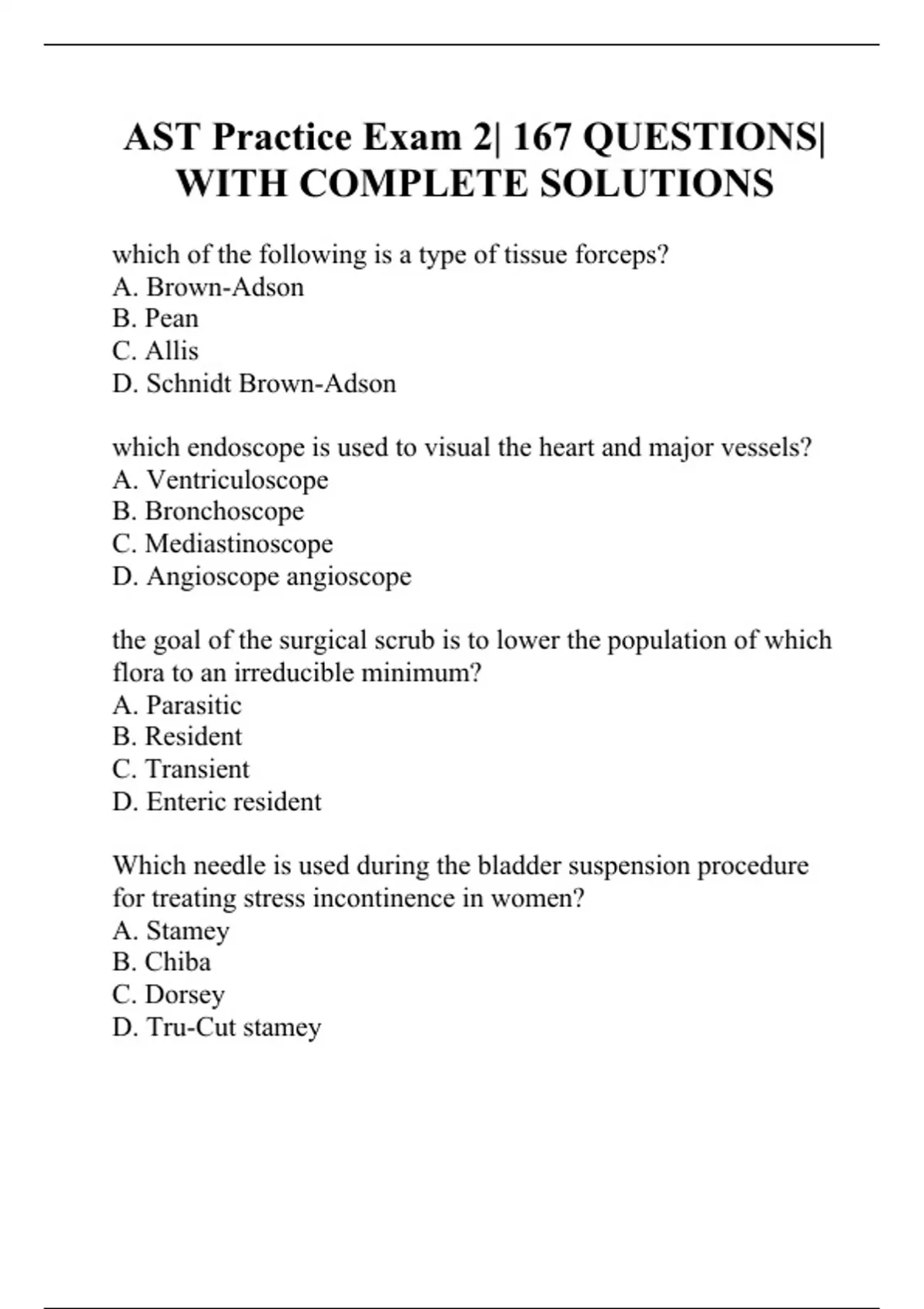 which of the following is a type of tissue forceps? A. Brown-Adson B. Pean C. Allis D. Schnidt Brown-Adson which endoscope is used to visual the heart and major vessels? A. Ventriculoscope B. Bronchoscope C. Mediastinoscope D. Angioscope angioscope the goal of the surgical scrub is to lower the population of which flora to an irreducible minimum? A. Parasitic B. Resident C. Transient D. Enteric resident Which needle is used during the bladder suspension procedure for treating stress incontinence in women? A. Stamey B. Chiba C. Dorsey D. Tru-Cut stamey which procedure can be performed without making an incision to treat varicose vein? A. Sclerotherapy B. Varicocelectomy C. Vein Ligation D. Vein stripping sclerotherapy when repairing a direct hernia, the surgeon works within the anatomical triangle formed by the inguinal ligament, inferior epigastric vessels and the later border of the rectus abdominis called: A. Femoral B. Anterior C. Hesselbach's D. Calot's hesselbach's which of the following is the correct postoperative sequence of actions completed by the surgical technologist? 1. assist with postoperative patient care 2. remove drapes 3. remove gown and gloves 4. break down the sterile setup A. 2, 1, 4, 3 B. 2, 3, 1, 4 C. 3, 2, 4, 1 D. 4, 2, 1, 3 2, 3, 1, 4 what should be completed before the sterile items are opened for the first procedure of the day? A. Lower temperature in the OR