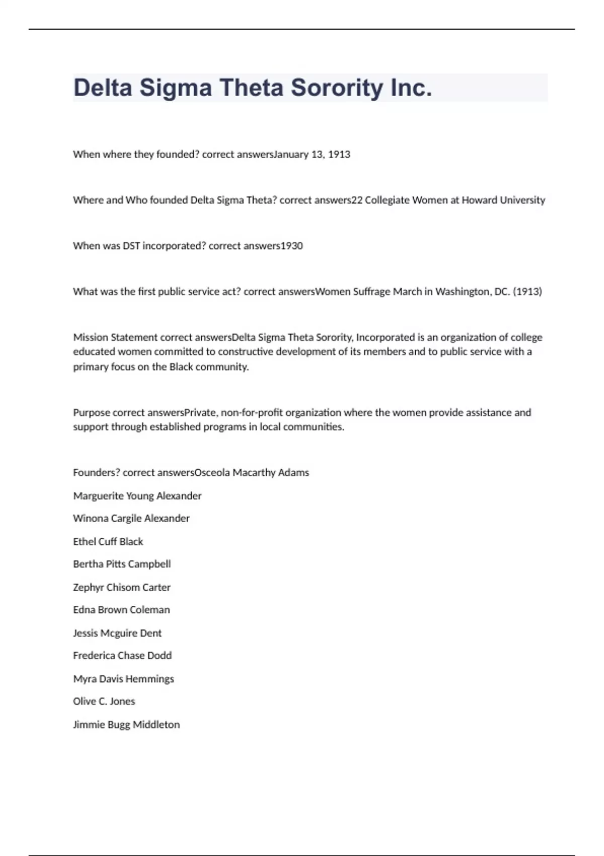 When where they founded? January 13, 1913 Where and Who founded Delta Sigma Theta? 22 Collegiate Women at Howard University When was DST incorporated? 1930 What was the first public service act? Women Suffrage March in Washington, DC. (1913) Mission Statement Delta Sigma Theta Sorority, Incorporated is an organization of college educated women committed to constructive development of its members and to public service with a primary focus on the Black community. Purpose Private, non-for-profit organization where the women provide assistance and support through established programs in local communities. Founders? Osceola Macarthy Adams Marguerite Young Alexander Winona Cargile Alexander Ethel Cuff Black Bertha Pitts Campbell Zephyr Chisom Carter Edna Brown Coleman Jessis Mcguire Dent Frederica Chase Dodd Myra Davis Hemmings Olive C. Jones Jimmie Bugg Middleton Pauline Oberdorfer Minor Vashti Turley Murphy Naomi Sewell Richardson Mamie Reddy Rose Eliza Pearl Shippen Florence Letcher Toms Ethel Carr Watson Wertie BlackWell Weaver Madree Penn White Edith Motte Young National President & CEO Beverly E. Smith National First Vice President Cheryl Hickmon (Alpha Xi Chapter) National Second Vice Presdient Jaria Martin (Beta Psi Chapter) National Secretary Elsie Cooke-Holmes (Epsilon Kappa Chapter) National Treasurer Deborah Jones-Buggs (Gamma Nu Chapter) Five-Point Programmatic Thrust Educational Development Economic Development International Awareness and Involvement Physical and Mental Health Political Awareness and Involvement