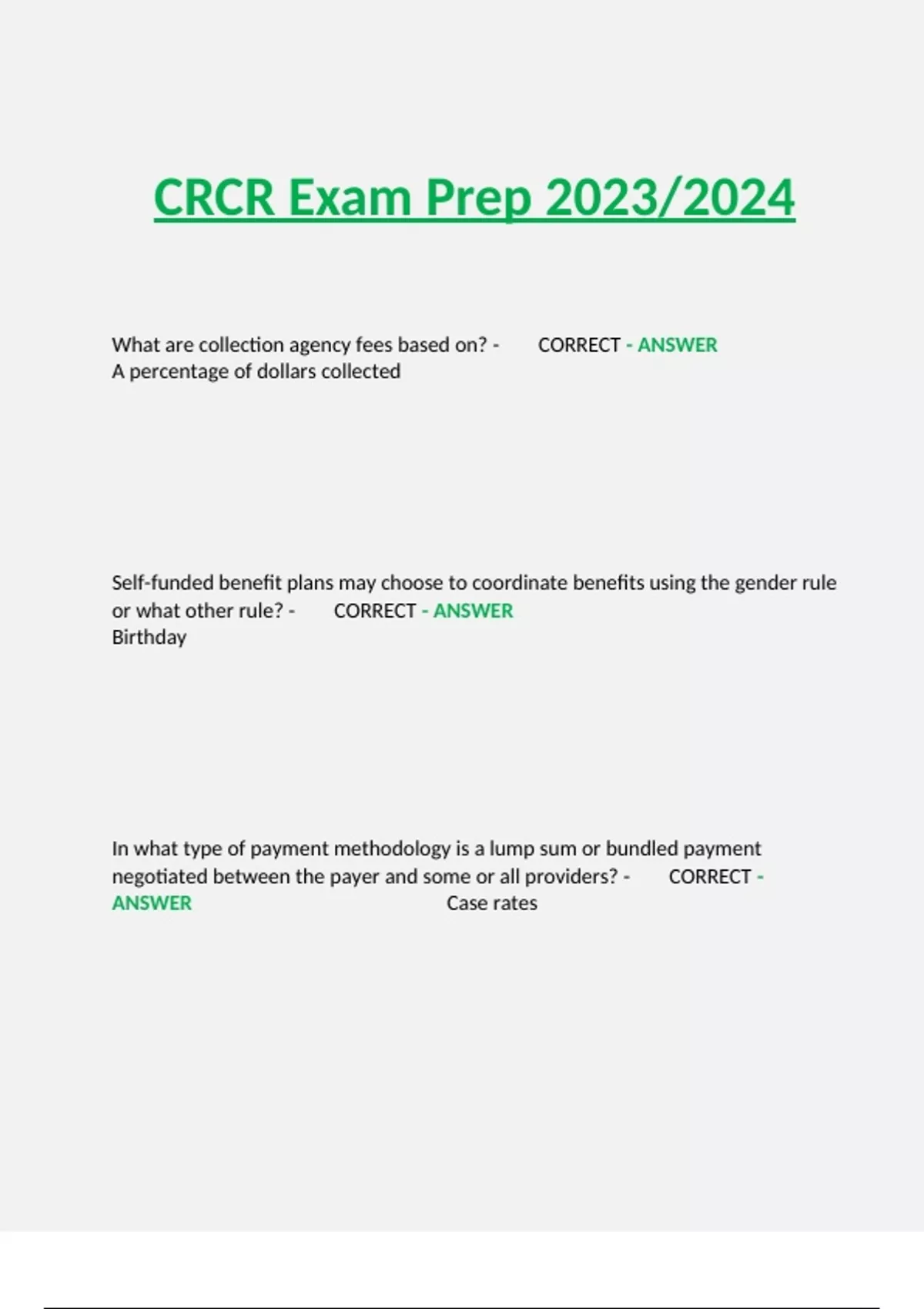 Certified Revenue Cycle Representative EXAM 2023/2024 CRCR Exam Prep 2023/2024 What are collection agency fees based on? - CORRECT - ANSWER A percentage of dollars collected Self-funded benefit plans may choose to coordinate benefits using the gender rule or what other rule? - CORRECT - ANSWER Birthday In what type of payment methodology is a lump sum or bundled payment negotiated between the payer and some or all providers? - CORRECT - ANSWER Case rates What customer service improvements might improve the patient accounts department? - CORRECT - ANSWER Holding staff accountable for customer service during pe
